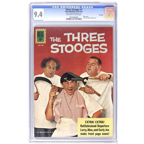 <B>Three Stooges #7 File Copy (Dell, 1962) CGC NM 9.4 Off-white to white pages.</B></I> Photo cover. Professor Putter backup story. Overstreet 2006 NM- 9.2 value = $170. CGC census 5/06: 9 in 9.4, none higher. <I>From the Random House Archives</B></I>. <BR><BR><B>Important notice:</B> Heritage usually auctions material at the rate of 200-250 lots per hour. On some occasions eBay Live bid software or the Internet may not be able to keep up with the pace of the auction. We recommend placing a realistic absentee bid now as insurance to avoid disappointment. Occasionally the auctioneer may eliminate or reject an eBay Live bid, and the auctioneer may also reopen a lot after the close of the eBay live bidding (usually because we missed an audience bid), and may reject your bid even if it shows you as the winning bidder. By bidding via eBay Live, you agree that Heritage may award the lot to another bidder at its sole discretion under the circumstances described above or any other reasonable circumstances. Since eBay bids are not shown to us until we open the lot on the floor, we treat those bids just like floor bids. In most cases the floor responds before the eBay bid is presented to us, due to Internet lag time, so for consistency we have made it a policy that floor bids are always considered first over tie eBay live bids. Also please note that all Heritage lots purchased through eBay Live carry a 22.5% Buyer's Premium. Please make sure you read the Terms and Conditions before you bid. This lot is being auctioned in conjunction with a live floor auction by Heritage Auction Galleries. All final auction and invoice information will be supplied by Heritage Auction Galleries, and all other information should be considered preliminary. Lot:41001 <BR><BR><B>Winning Notification and Billing:</B> After the FINAL session in this auction is complete, Heritage will send e-mail and snail mail invoices. This process normally takes several days. All final auction and invoice information will be supplied by Heritage Auction Galleries, and all other information should be considered preliminary. <BR><BR>This auction will be conducted on a live auction floor and over the Internet through eBay Live. If you choose to place an absentee bid, please take a moment to <font color='#0000ff'><u><a href='http://pages.ebay.com/liveauctions/help/before/laabsentee.html'>learn how eBay Live absentee bidding works</a></u></font><font color='#000000'>