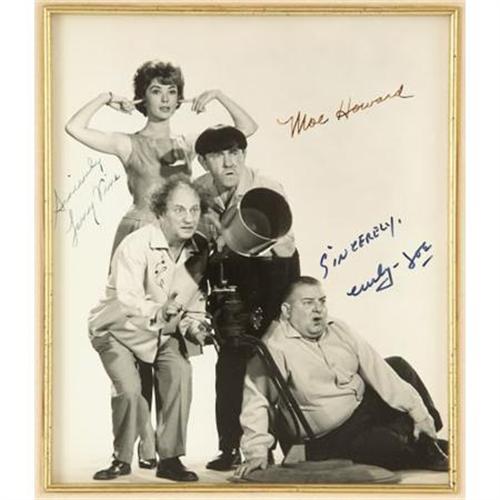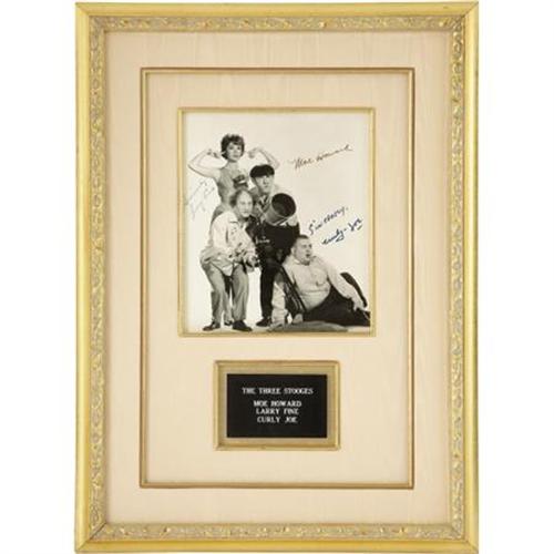 <B>Three Stooges Autographed Photo.</B></I> Larry, Moe, and Curly Joe -- the Stooge team from 1958-1975 -- caught the interest of the baby boomers in 1959 when the Stooges film library was syndicated to television. From there, the Stooges experienced a resurgence in popularity and success, making a series of full-length films from 1959-1965 and becoming one of the most popular and highest-paid live acts in the country. Included is a b&w 8" x 10" signed by Moe, Larry, and Curly Joe, an increasingly hard to find grouping, beautifully matted and framed to an overall size of 16" x 21.5." In Excellent condition. <I>Accompanied by a COA from PSA/DNA.</B></I><BR><BR><b>Shipping:</b> Framed - with Glass, Medium (<a target="_blank" href="http://www.heritageauctions.com/common/shipping.php">view shipping information</a>)