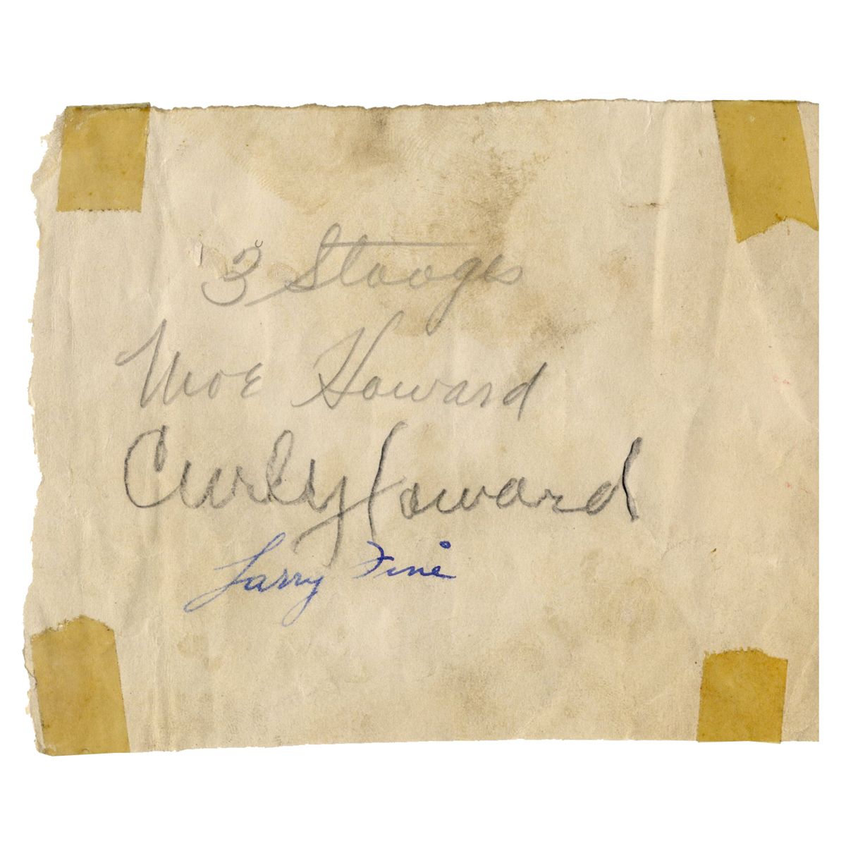Autographed page signed by each of the original members of the slapstick film trio, The Three Stooges. Moe Howard signs: ''3 Stooges / Moe Howard'' in pencil. Curly Howard signs: ''Curly Howard'' also in pencil. Larry Fine signs ''Larry Fine'' in blue pen. The famous trio starred in numerous short comedy films, earning their place as the consummate slapstick comedians. The 4.5'' x 3.75'' page has tape in each corner and some staining. Good to very good condition with clear, bold autographs. With PSA/DNA COA.