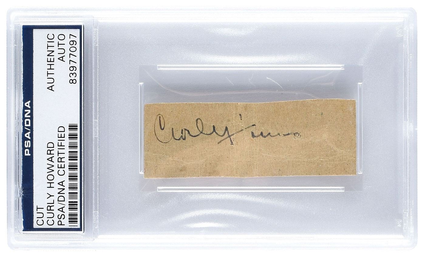 Vintage ink signature, "Curly Howard,” on a beige 2.75 x 1 slip. Encapsulated in a PSA/DNA authentication holder. In very good to fine condition, with light overall creasing.