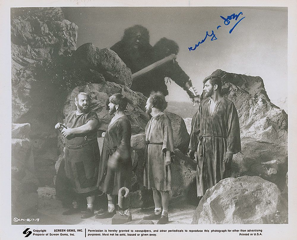 Glossy 10 x 8 promotional photo for The Three Stooges Meet Hercules, signed in blue felt tip, “Curly-Joe.” A diagonal crease to the lower right, otherwise fine condition.