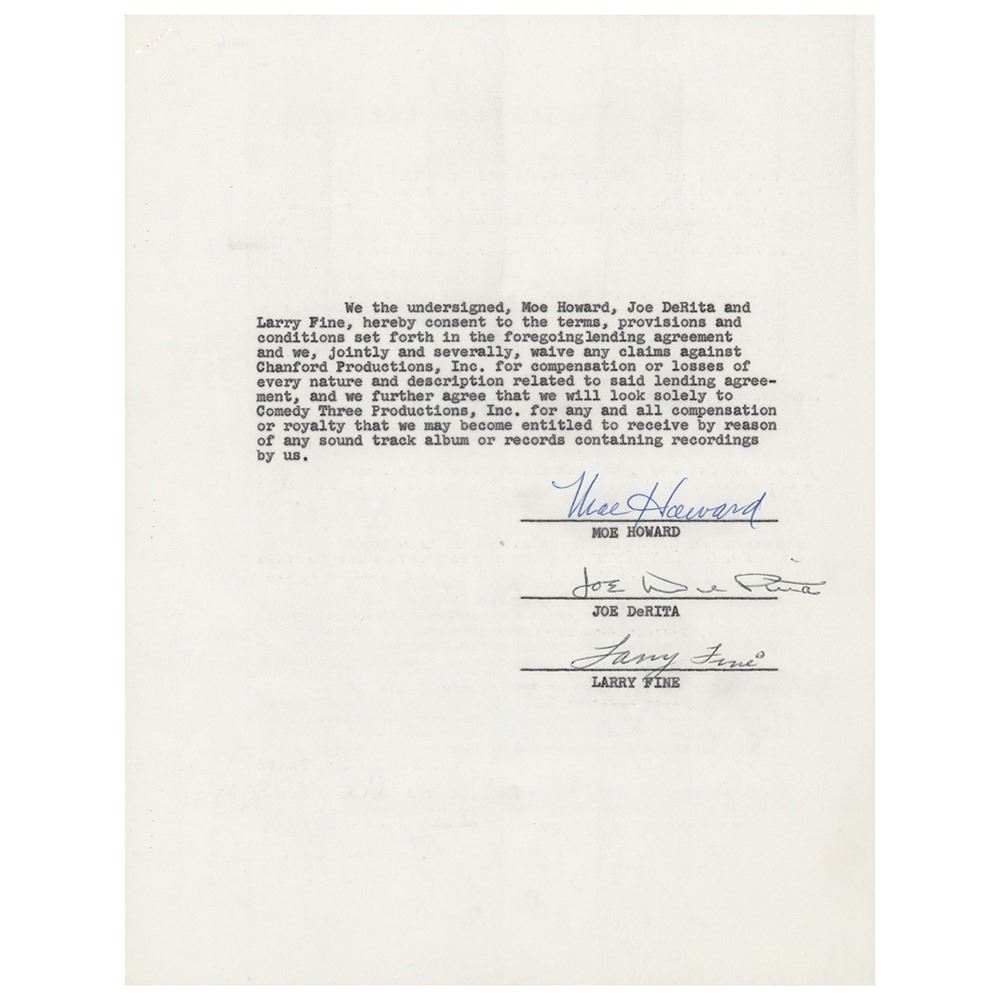 DS, five pages, 8.5 x 11, February 15, 1961. Agreement between the Three Stooges and Chanford Productions concerning royalties for a soundtrack album for "the motion picture tentatively entitled 'Snow White and the Three Stooges.'" Signed on the fourth page in ballpoint by Howard, "Moe Howard, President," and on the next page by all three, "Moe Howard," "Joe DeRita," and "Larry Fine." Includes the original blue legal folder. In fine condition.