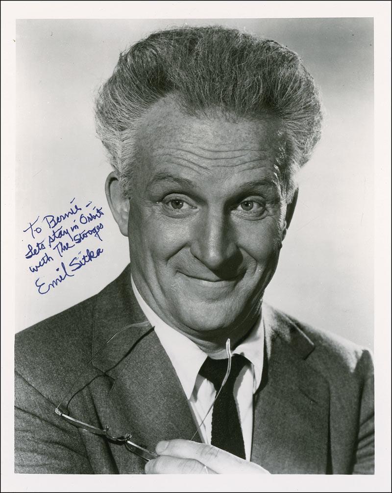 Glossy 7.5 x 9.5 photo of Sitka as he appeared in the 1962 film The Three Stooges in Orbit, signed and inscribed in blue felt tip “To Bernie– Let’s stay in Orbit with The Stooges. Emil Sitka.” In fine condition, with few scattered creases and trimmed edges. Pre-certified PSA/DNA and RRAuction COA.