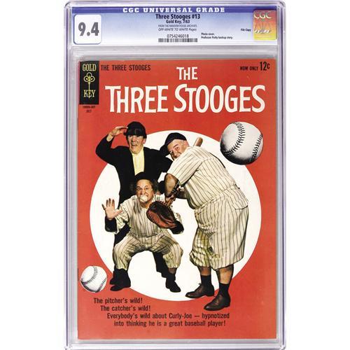 <B>Three Stooges File Copies CGC Box Lot (Gold Key, 1963-70).</B></I> This full box of slabbed copies offers plenty of nyuks for your bucks! A <B>CGC NM+ 9.6</B></I> copy of #46; <B>CGC NM 9.4</B></I> copies of #13, 17, 20, 21, 23, 24, 27, 29, 30, 31, 34, 37, 41, 42, 45, 47, 48, and 49; <B>CGC NM- 9.2</B></I> copies of #14, 28, 43, 52, 53, 54, and 55; <B>CGC VF/NM 9.0</B></I> copies of #11, 15, 25, 26, 50, and 51; and a <B>CGC VF+ 8.5</B></I> copy of #12. Approximate Overstreet value for group = $3,400. <I>From the Random House Archives.</B></I> <BR><BR><B>Important notice:</B> Heritage usually auctions material at the rate of 200-250 lots per hour. On some occasions eBay Live bid software or the Internet may not be able to keep up with the pace of the auction. We recommend placing a realistic absentee bid now as insurance to avoid disappointment. Occasionally the auctioneer may eliminate or reject an eBay Live bid, and the auctioneer may also reopen a lot after the close of the eBay live bidding (usually because we missed an audience bid), and may reject your bid even if it shows you as the winning bidder. By bidding via eBay Live, you agree that Heritage may award the lot to another bidder at its sole discretion under the circumstances described above or any other reasonable circumstances. Since eBay bids are not shown to us until we open the lot on the floor, we treat those bids just like floor bids. In most cases the floor responds before the eBay bid is presented to us, due to Internet lag time, so for consistency we have made it a policy that floor bids are always considered first over tie eBay live bids. Also please note that all Heritage lots purchased through eBay Live carry a 22.5% Buyer's Premium. Please make sure you read the Terms and Conditions before you bid. This lot is being auctioned in conjunction with a live floor auction by Heritage Auction Galleries. All final auction and invoice information will be supplied by Heritage Auction Galleries, and all other information should be considered preliminary. Lot:41001 <BR><BR><B>Winning Notification and Billing:</B> After the FINAL session in this auction is complete, Heritage will send e-mail and snail mail invoices. This process normally takes several days. All final auction and invoice information will be supplied by Heritage Auction Galleries, and all other information should be considered preliminary. <BR><BR>This auction will be conducted on a live auction floor and over the Internet through eBay Live. If you choose to place an absentee bid, please take a moment to <font color='#0000ff'><u><a href='http://pages.ebay.com/liveauctions/help/before/laabsentee.html'>learn how eBay Live absentee bidding works</a></u></font><font color='#000000'>