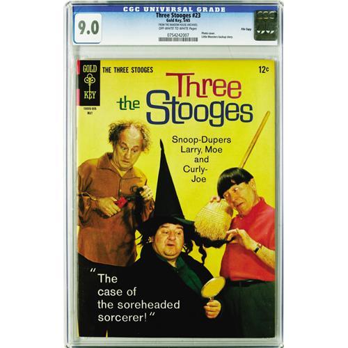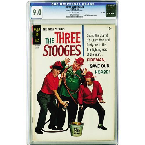<B>Three Stooges File Copies CGC Group (Gold Key, 1965-71).</B></I> Hey Moe, all issues in this group are CGC 9.0 and certified with "off-white to white" page quality unless otherwise noted. The issues included here are #21 (two copies; one with off-white pages and one with cream to off-white pages; CGC census 4/06: 3 in 9.0, 8 higher), #23 (3 in 9.0, 14 higher), #24 (2 in 9.0, 9 higher), #26 (CGC 8.5 off-white pages, 1 in 8.5, 2 higher), #27 (CGC 8.5; 1 in 8.5, 21 higher), #29 (CGC 8.5, 2 in 8.5, 16 higher), #33 (1 in 9.0, 3 higher), #34 (CGC 8.5, 1 in 8.5, 7 higher), #36 (1 in 9.0, 1 higher), #37 (2 in 9.0, 20 higher), #42 (4 in 9.0, 14 higher), #43 (2 in 9.0, 3 higher), #45 (6 in 9.0, 10 higher), #46 (1 in 9.0, 1 higher), #48 (white pages; 6 in 9.0, 19 higher), #49 (white pages; 1 in 9.0, 21 higher), #50 (white pages, 4 in 9.0, 16 higher), #51 (4 in 9.0, 14 higher), #52 (white pages; 3 in 9.0, 14 higher), and #53 (7 in 9.0, 16 higher). Approximate Overstreet value for group = $1,500. <I>From the Random House Archives.</B></I>