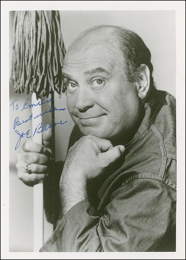Matte-finish 5 x 7 photo of Besser holding a mop, signed and inscribed in ink, “To Emily, Best wishes, Joe Besser.” In very fine condition.