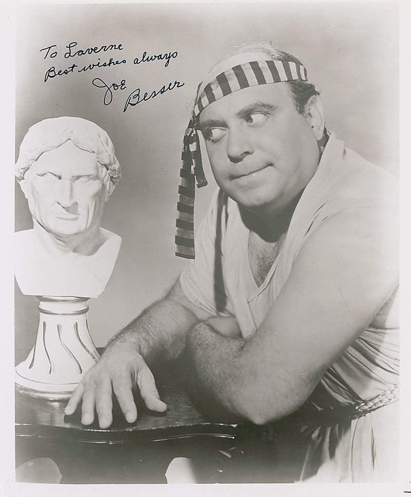 Glossy 8 x 9.5 photo of Besser humorously glaring at a bust, signed and inscribed in black felt tip, “To Laverne, Best wishes always, Joe Besser.” In fine condition, with slightly trimmed edges.