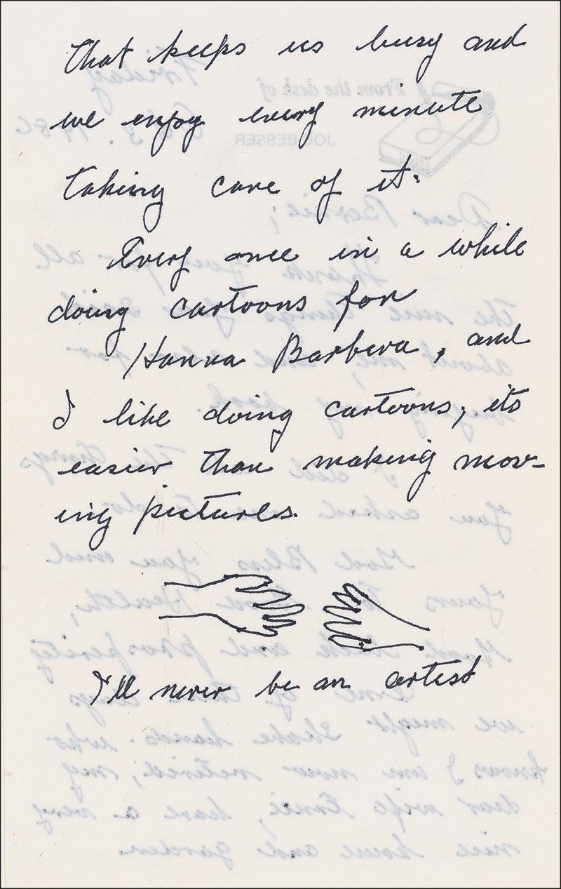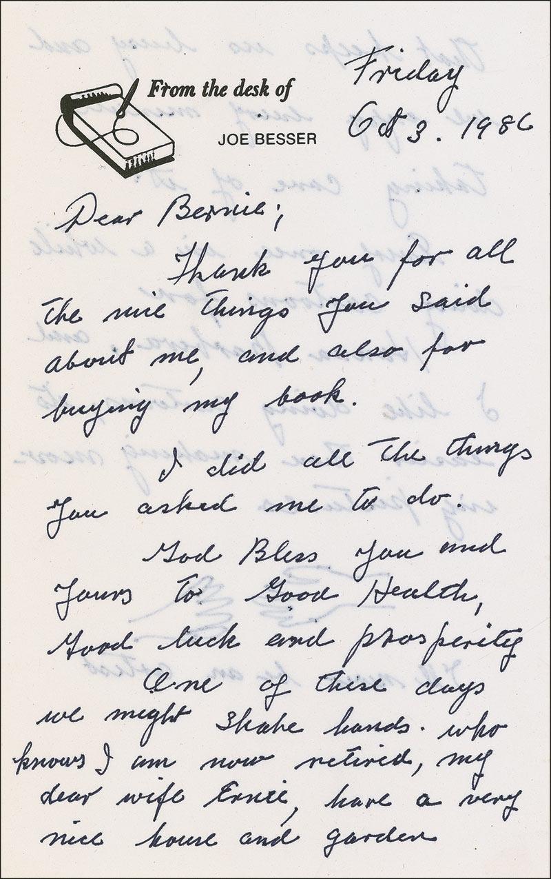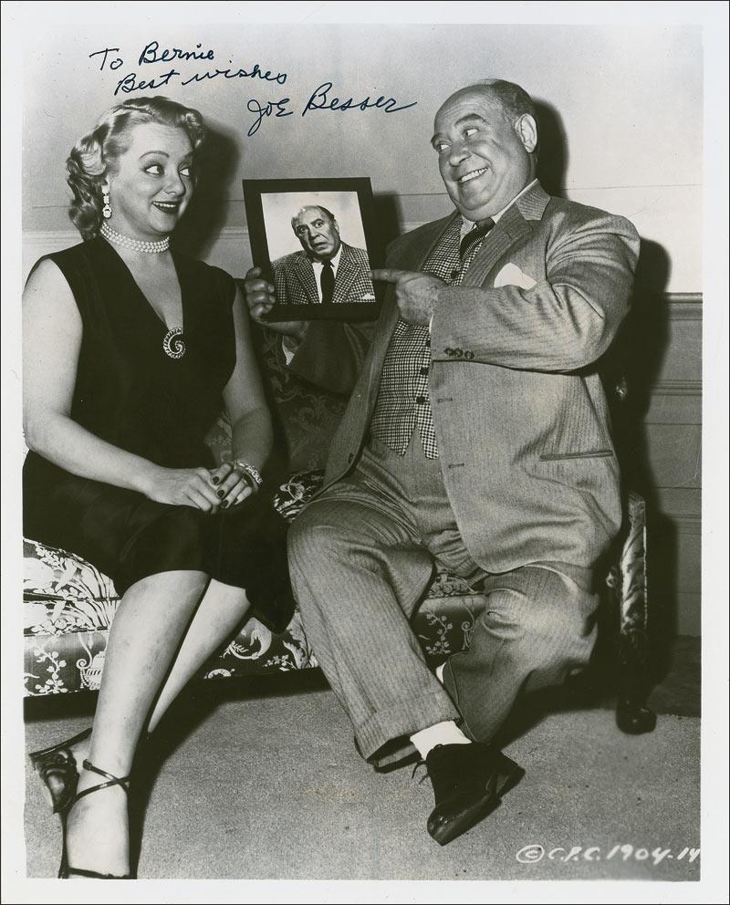 Two items: glossy 8 x 10 photo of Besser and a female companion admiring a photo of himself, signed and inscribed in black felt tip, “To Bernie, Best wishes, Joe Besser”; and an unsigned ALS, one page both sides, 5 x 8, personal letterhead, October 3, 1986. Letter to an admirer. In part: “One of these days we might shake hands. Who knows. I am now retired, my dear wife Ernie, have [sic] a very nice house and garden that keeps us busy and we enjoy every minute taking care of it. Every once in a while doing cartoons for Hanna Barbera, and I like doing cartoons, it’s easier than making moving pictures.” Besser has then drawn a picture of two hands reaching out to each other and the amusing postscript, “I’ll never be an artist.” In overall fine condition. Pre-certified PSA/DNA and RRAuction COA.