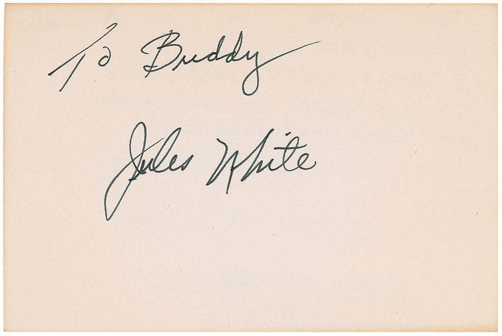 Film director and producer (1900-1985) best known as the director and producer of most Three Stooges shorts between 1937 and 1959. Scarce felt tip signature, “To Buddy, Jules White,” on an off-white 6 x 4 card. In fine condition, with mild toning around the edges and slight show through from collector’s notations on reverse. Originally acquired from the Buddy George Marshall in-person Hollywood collection.