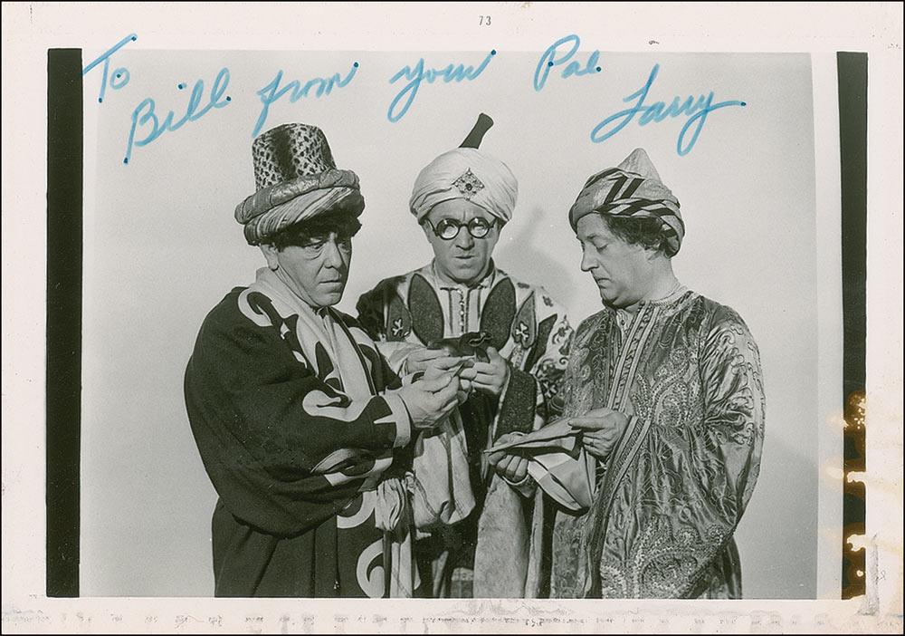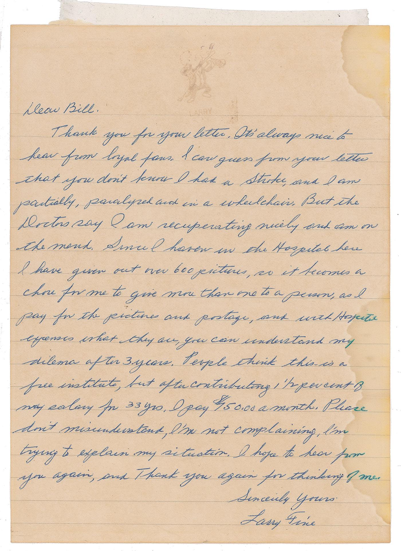 ALS, one page, 6 x 8, no date [circa 1970]. Larry writes to a collector. In part: “It’s always nice to hear from loyal fans. I can guess from your letter that you don’t know I had a stroke, and I am partially paralyzed and in a wheelchair. But the Doctors say I am recuperating nicely and am on the mend…I have given out over 600 pictures, so it becomes a chore for me to give more than one to a person, as I pay for the pictures and postage, and with Hospital expenses what they are, you can understand my dilema [sic] after 3 years. People think this is a free institute, but after contributing 1-1/2 percent of my salary for 33 yrs. I pay $750.00 a month. Please don’t misunderstand, I’m not complaining, I’m trying to explain my situation. I hope to hear from you again.”; and a 5 x 3.5 matte-finish photo of Moe, Larry, and Shemp, signed and inscribed in blue ink, “To Bill, from your pal, Larry.” In very good condition, with areas of soiling, staining along the right side affecting a few words of text, and a strip of adhesive at the top of the page; the photo shows scattered surface wear. Fine suffered a debilitating stroke that paralyzed the left side of his body in 1970. He moved to the Motion Picture House, an industry retirement community, a short time later.