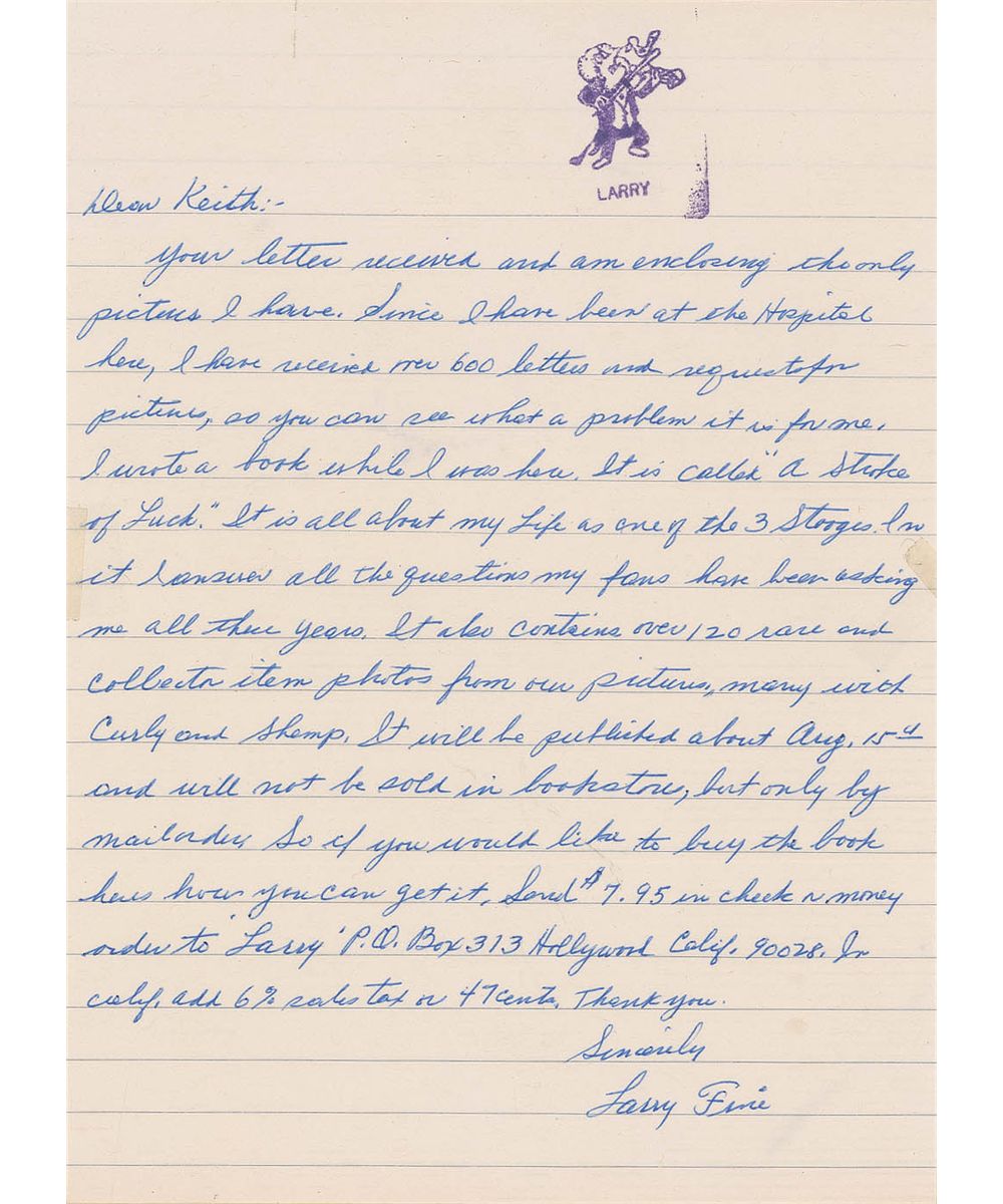 ALS signed “Larry Fine,” one page, lightly-lined, 5.75 x 8, stamped personal letterhead, no date. Letter to a fan written while in the hospital recovering from a stroke. In part: “I wrote a book while I was here. It is called ‘A Stroke of Luck.’ It is all about my life as one of the 3 Stooges…It also contains over 120 rare and collector item photos of our pictures, many with Curly and Shemp.” In fine condition. Accompanied by the original mailing envelope, addressed by Larry, who has printed his name in the return address area.