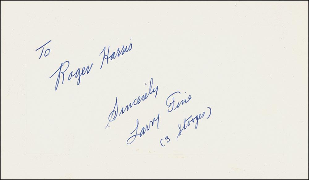 Ballpoint signature and inscription, “To Roger Harris, Sincerely, Larry Fine (3 Stooges),” on a white double weight 5.75 x 3.5 custom-made collector’s card. In very fine condition. Pre-certified PSA/DNA and RRAuction COA.