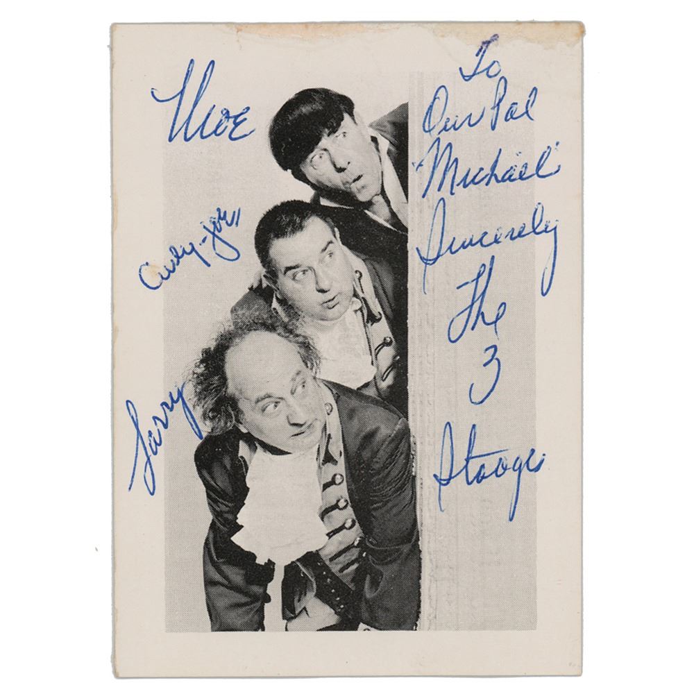 Vintage glossy 2.5 x 3.5 photo of the Three Stooges peeking out from behind a door, signed and inscribed in blue ballpoint by Moe Howard on behalf of all three: "To our pal 'Michael,' Sincerely The 3 Stooges, Moe, Curly-Joe, Larry.” Reverse is imprinted with fan club information. In fine condition.