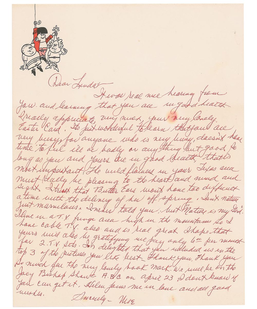 ALS signed “Moe,” one page, 8.5 x 11, comical Three Stooges letterhead, no date, but postmarked April 12, 1968. Letter written to his friend and admirer Linda. In part: “I trust that Butter Ears won’t have too difficult a time with the delivery of her new offspring. Isn’t nature just marvelous. I never told you, but ‘Nature is my God’…We will be on the Joey Bishop show ABC on April 23. I don’t know if you can get it.” Accompanied by the original mailing envelope, addressed in Howard’s hand. Several small spots to text of letter as well as the envelope, otherwise fine condition.
