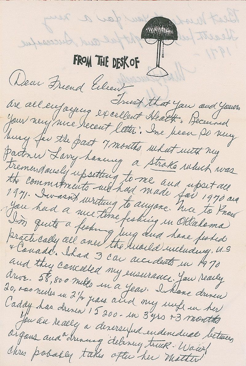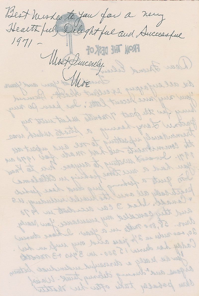 ALS signed “Moe,” one page both sides, 6 x 8.5, illustrated personal letterhead, no date. Letter to an admirer. In part: “Received your very nice recent letter. I’ve been so very busy for the past 7 months what with my partner Larry having a stroke which was tremendously upsetting to me and upset all the commitments we had made for 1970 and 1971. I wasn’t writing to anyone.” In fine condition. Accompanied by a pair of rose colored Three Stooges souvenir stamps, one picturing Larry Fine, the other depicting all 3 Stooges. The stamps were published in 1959 by Norman Maurer Productions.