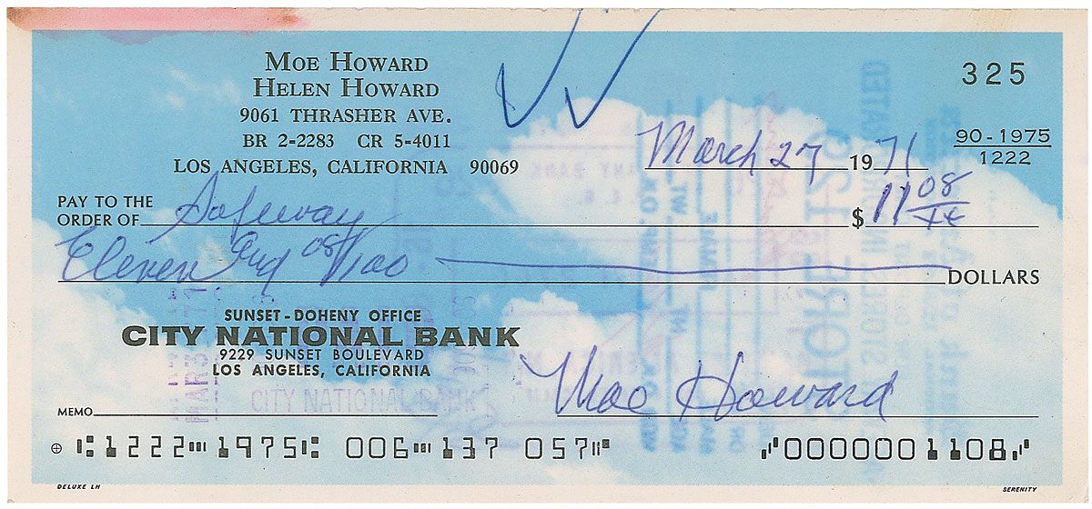 Personal check, 6 x 2.75, filled out and signed by Howard, payable to Safeway for $11.08, March 27, 1971. Some show-through from stamp on reverse, expected stamps, and some light discoloration along top edge, otherwise fine condition.