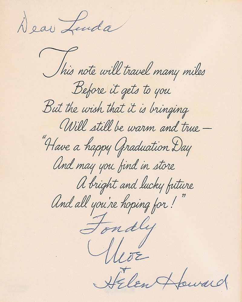 Graduation card to longtime friend and admirer Linda Dill. Card measures 4.75 x 6 closed, with a pre-printed sentiment inside, inscribed at the top, “Dear Linda,” and signed at the bottom, “Fondly Moe & Helen Howard.” In fine condition. Accompanied by the original mailing envelope, addressed by Howard, and postmarked May 2, 1963.