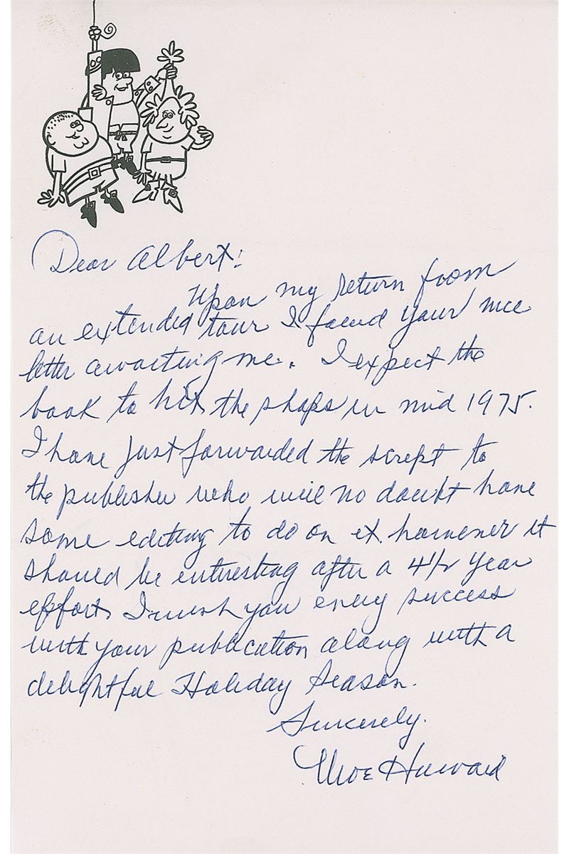 ALS signed “Moe Howard,” one page, 5.25 x 8.5, illustrated Three Stooges letterhead, no date. Letter to a fan. In part: “Upon my return from an extended tour I found your nice letter…I expect the book to hit the shops in mid 1975. I have just forwarded the script to the publisher who will no doubt have some editing to do on it however it should be interesting after a 4 1/2 year effort.” In very fine condition.