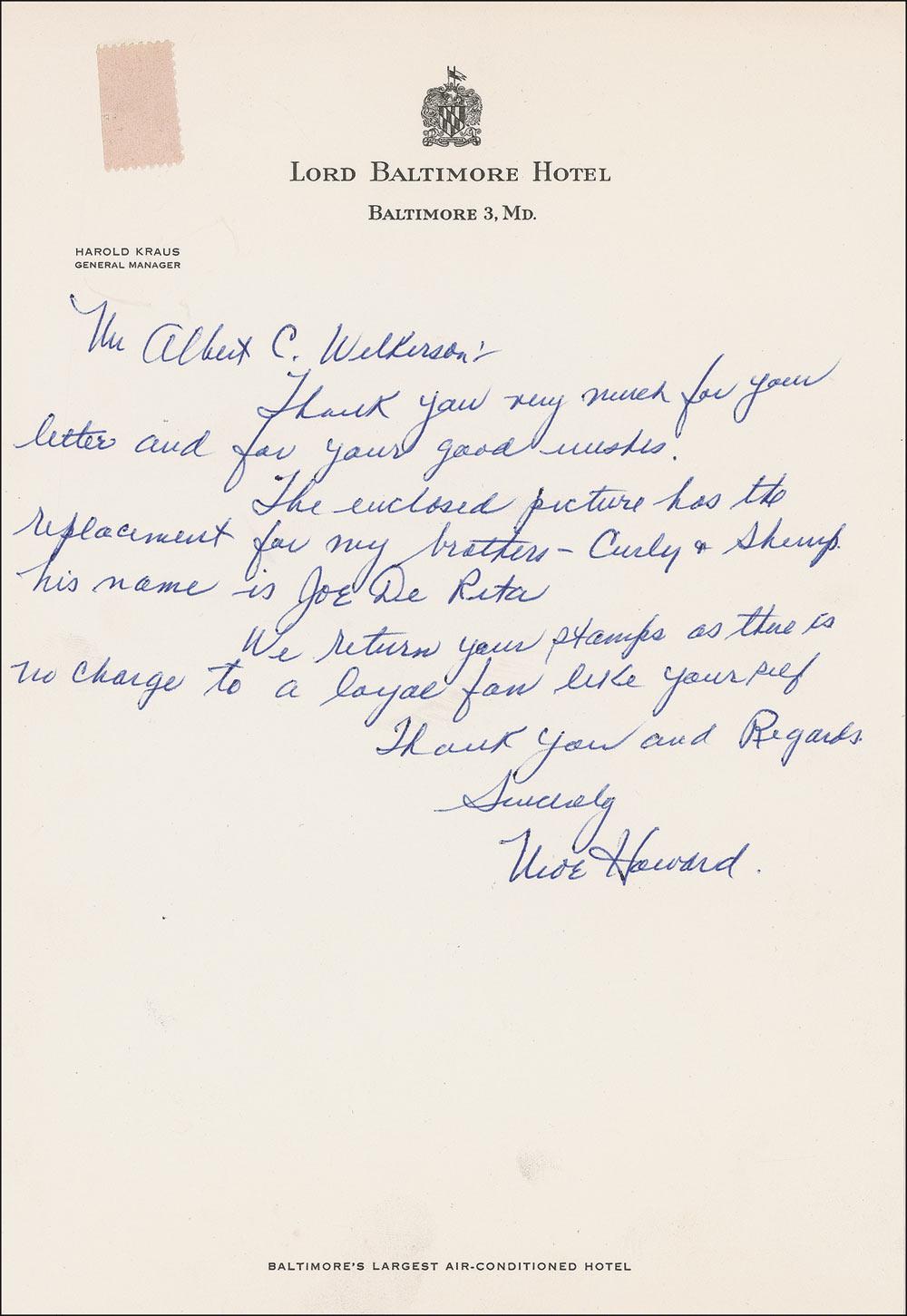 ALS, one page, 7.25 x 10.5, Lord Baltimore Hotel letterhead, no date. Letter to a fan. In part: “The enclosed picture [not included] has the replacement for by brothers–Curly & Shemp, his name is Joe DeRita. We return your stamps as there is no charge to a loyal fan like yourself.” In fine condition, with a partial stamp affixed to top left corner. Pre-certified PSA/DNA and RRAuction COA.