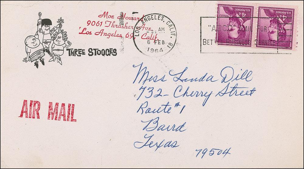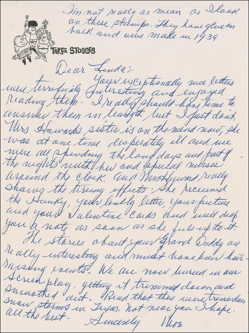 ALS signed “Moe,” one page, 6 x 8, pictorial Three Stooges letterhead letterhead, no date. A friendly letter to a fan. In part: “Mrs. Howard’s sister is on the mend now, she was at one time desperately ill and we were all spending the long days and part of the nights with her and special nurses around the clock. And Mrs. Howard really shows the tiring effects…. The stories about your Grand Daddy are really interesting and must have been hair-raising events. We are now buried in our screenplay, getting it trimmed down and smoothed out.” In fine condition. Accompanied by the original mailing envelope addressed in Moe’s hand, postmarked February 6, 1964. The screenplay Moe refers to is likely that for the Stooges’ penultimate movie, The Outlaws Is Coming, released in 1965. Pre-certified PSA/DNA and RRAuction COA.