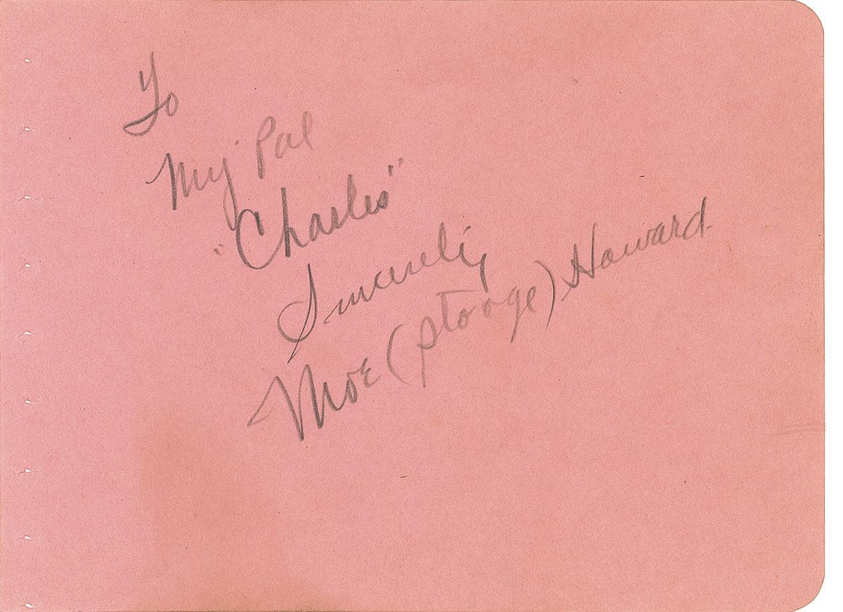 Vintage pencil signature, “To my pal ‘Charles’ Sincerely, Moe (Stooge) Howard,” on a light pink 6 x 4.5 album page. In fine condition, with a bit of light toning to bottom of page. Pre-certified PSA/DNA and RRAuction COA.