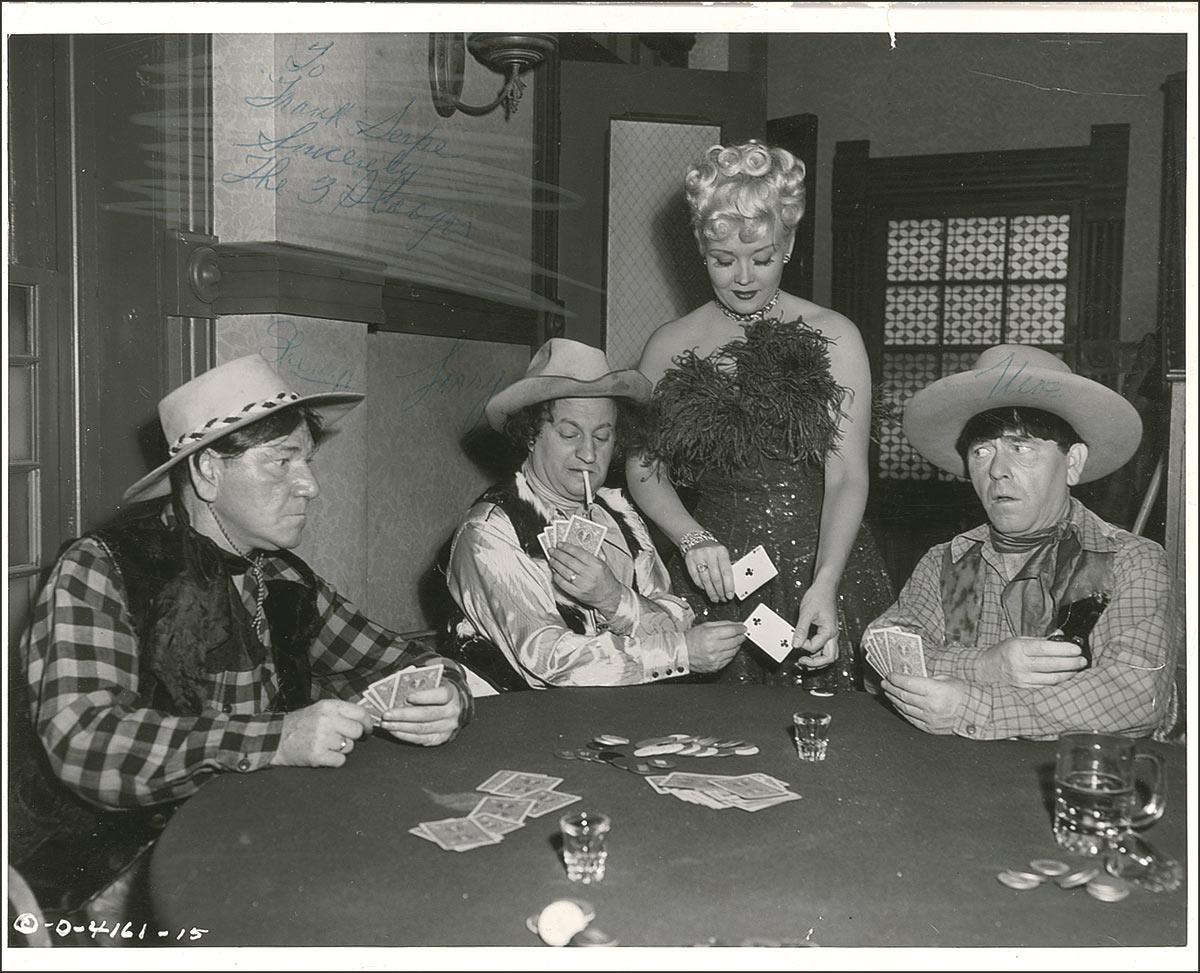 Vintage glossy 10 x 8 Columbia Pictures publicity photo of Moe, Larry, and Shemp playing poker as Marion Martin helps Larry cheat, signed and inscribed in blue ballpoint “To Frank Serpe, Sincerely, The 3 Stooges, Moe,” and “Shemp,” and “Larry,” with Moe signing for Shemp and Larry. Light intentional surface rubbing under Moe’s inscription for better adhesion, scattered light creases and surface crazing, a bit of light skipping to Moe’s Shemp signature, and a couple dings and edge tears to top edge, otherwise very good condition.