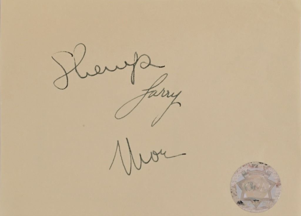 Three Stooges autograph slip signed by Larry Fine, Moe Howard and Curly Howard. GFA Authenticated. HL5384