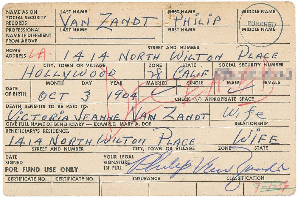 Character actor known for roles in Three Stooges shorts. Van Zandt’s rare off-white AFTRA union P&W benefits card, one page both sides, 6 x 4, dated no date. Pension and Welfare benefit card filled out in another hand in blue ballpoint including his California address, birthdate, and Social Security number. Signed at the bottom “Philip Van Zandt.” A handwriting notation across the front reads “Deceased.” On the reverse in another hand his wife and children are listed as beneficiaries. With “Deceased” notation affecting portions of writing, and a few small spots of soiling to top edge, otherwise fine condition and in a much cleaner state than these cards are usually found.