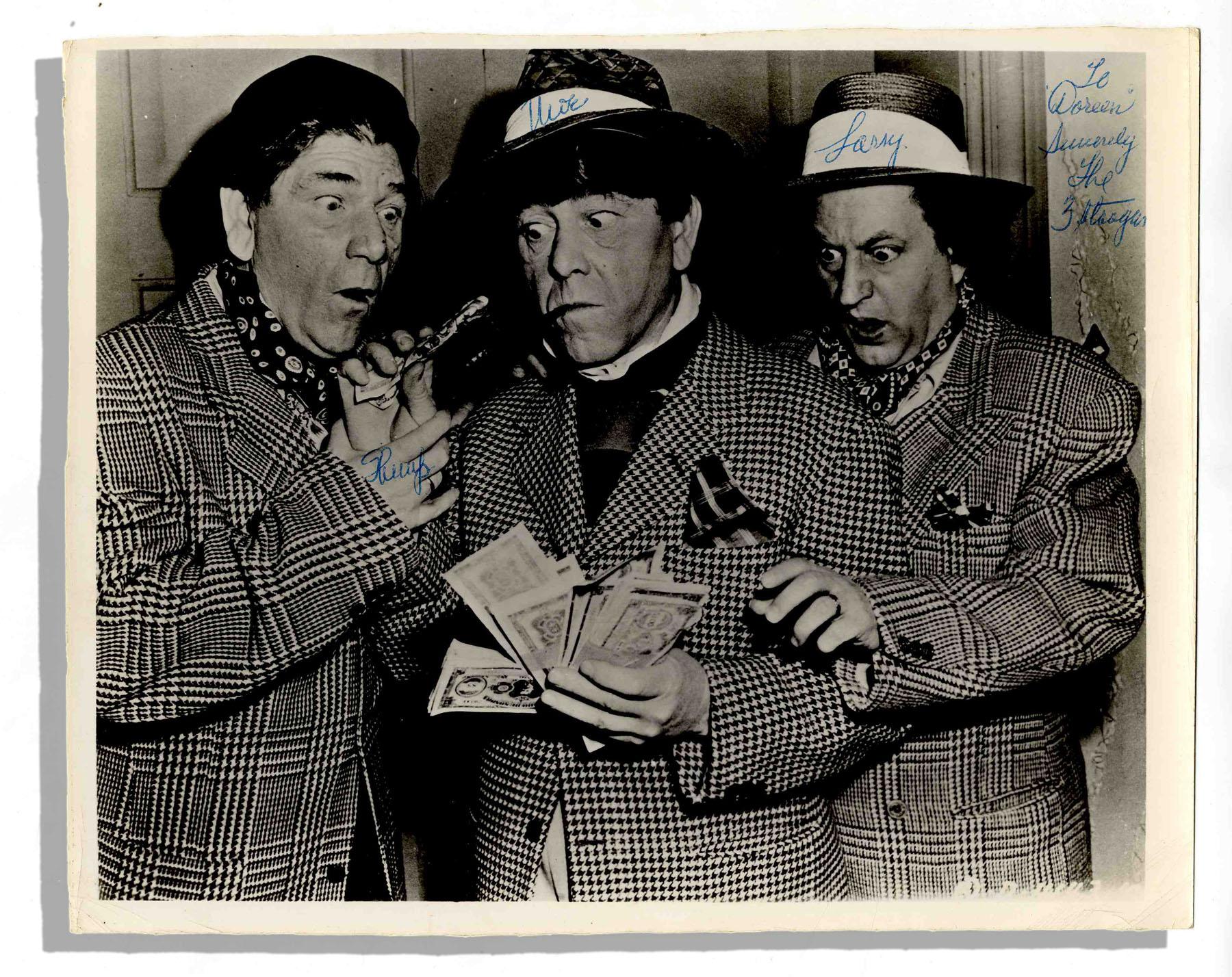 Three Stooges signed photo, signed by each Stooge on their image, ''Shemp'', ''Moe'' and ''Larry''. Inscribed in the right margin, likely by Larry, ''To Doreen / Sincerely The 3 Stooges''. 10'' x 8'' glossy photograph is in very good condition with light creasing to corners and trimmed margins.