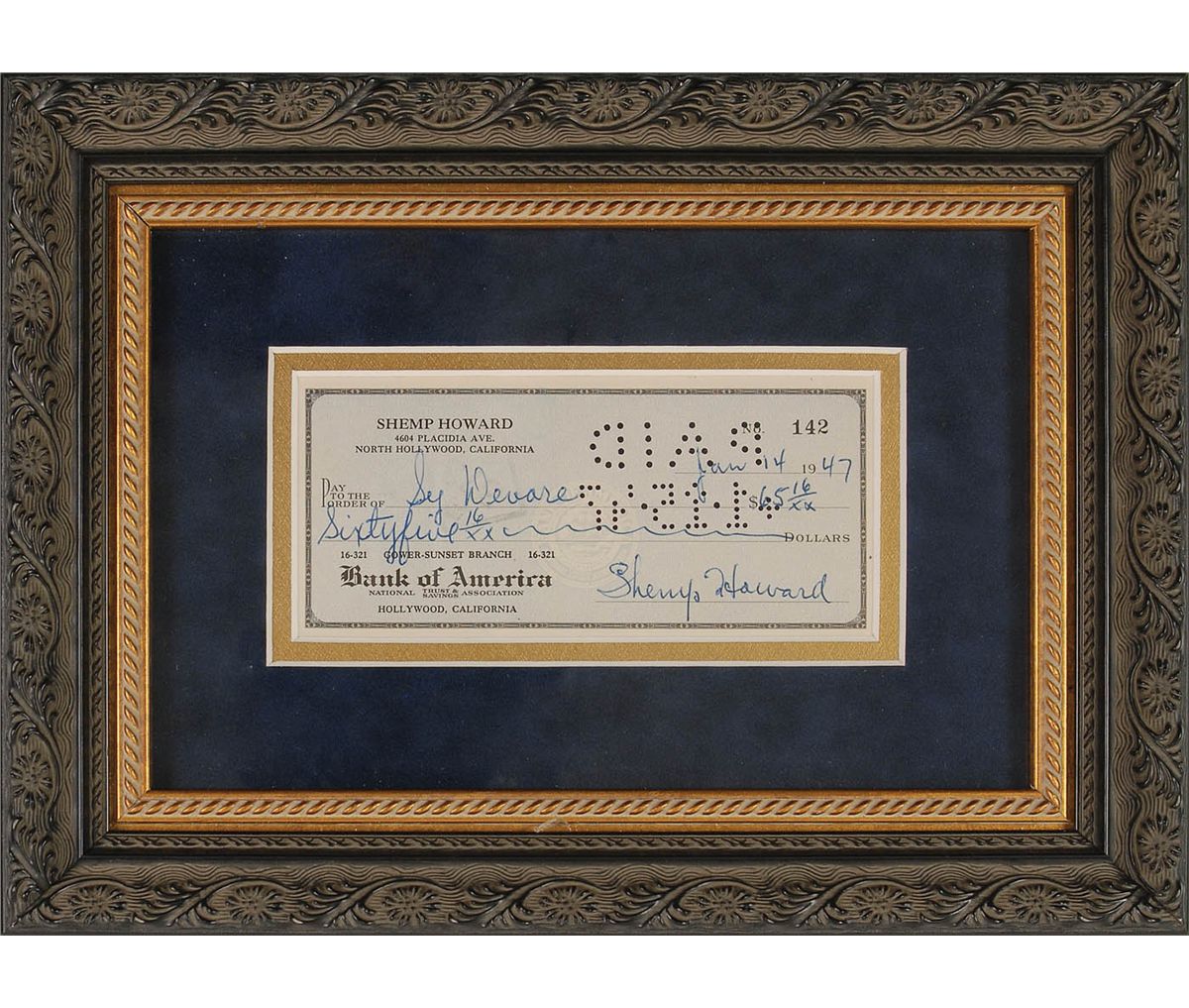 Rare personal check, 6 x 2.75, filled out in another hand and signed by Howard, “Shemp Howard,” payable to Sy Devore for $65.16, January 14, 1947. Double matted and framed to an overall size of 12 x 8.75. In fine condition, with expected cancellation holes and stamps. Devore was known as the ‘Tailor to the Stars’ and is best known for outfitting the Rat Pack—a great intersection of Hollywood history.