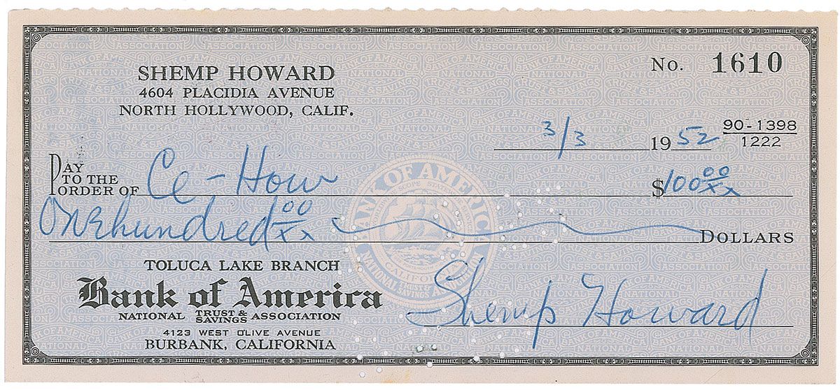 Personal check, 6 x 2.75, filled out and signed by Howard, payable to Ce-How for $100.00, March 3, 1952. In fine condition, with cancellation holes to body, lightly affecting first name of signature.
