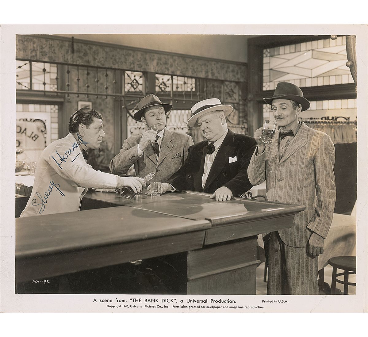 Uncommon vintage glossy 10 x 8 Universal promotional photo of Shemp pouring a drink for W. C. Fields in The Bank Dick, signed in fountain pen. Scattered creases to right side and a paperclip impression to top edge, otherwise fine condition.