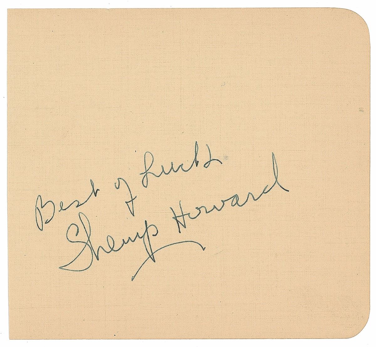 Ink signature, “Best of Luck, Shemp Howard,” on an off-white 4.75 x 4.25 album page. In fine condition.