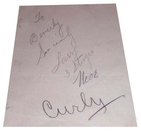Vintage signatures by the Three Stooges, circa 1939. Pencil signatures appear on a 3'' x 4'' slip of white paper upon which Larry has inscribed, ''To Beverly / Sincerely / Larry / 3 Stooges'' after which Moe and Curly sign their names. Paper is mounted to a 5.5'' x 4.5'' yellow autograph album page. In very good condition with one fold running through Moe's name and light creasing.