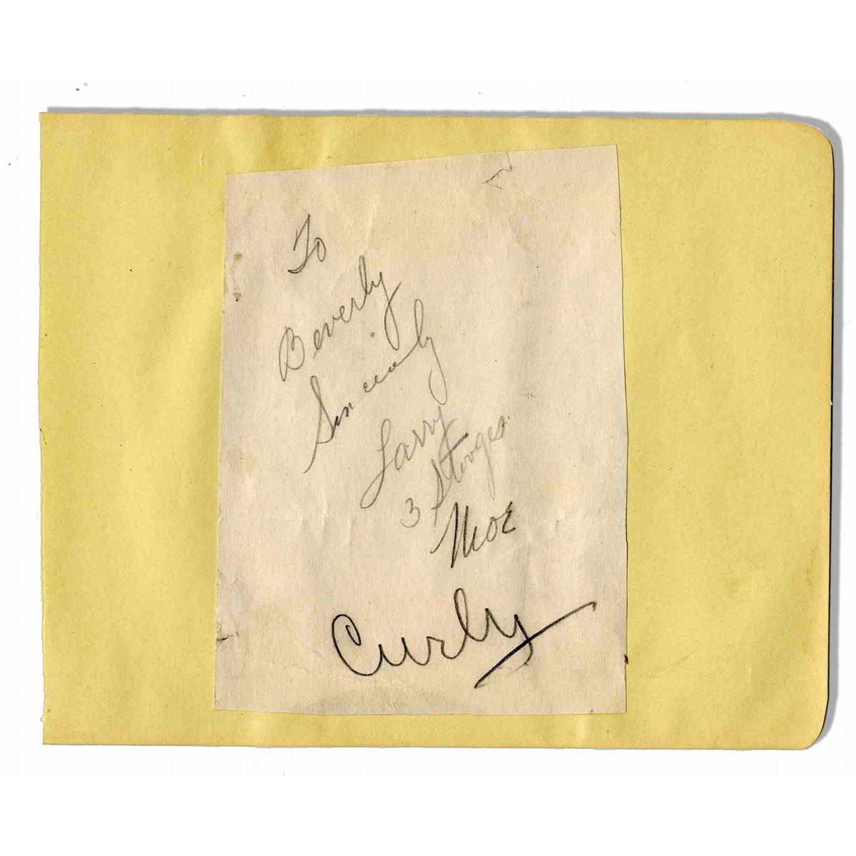 Vintage signatures by the Three Stooges, circa 1939. Pencil signatures appear on a 3'' x 4'' slip of white paper upon which Larry has inscribed, ''To Beverly / Sincerely / Larry / 3 Stooges'' after which Moe and Curly sign their names. Paper is mounted to a 5.5'' x 4.5'' yellow autograph album page. In very good condition with one fold running through Moe's name and light creasing.