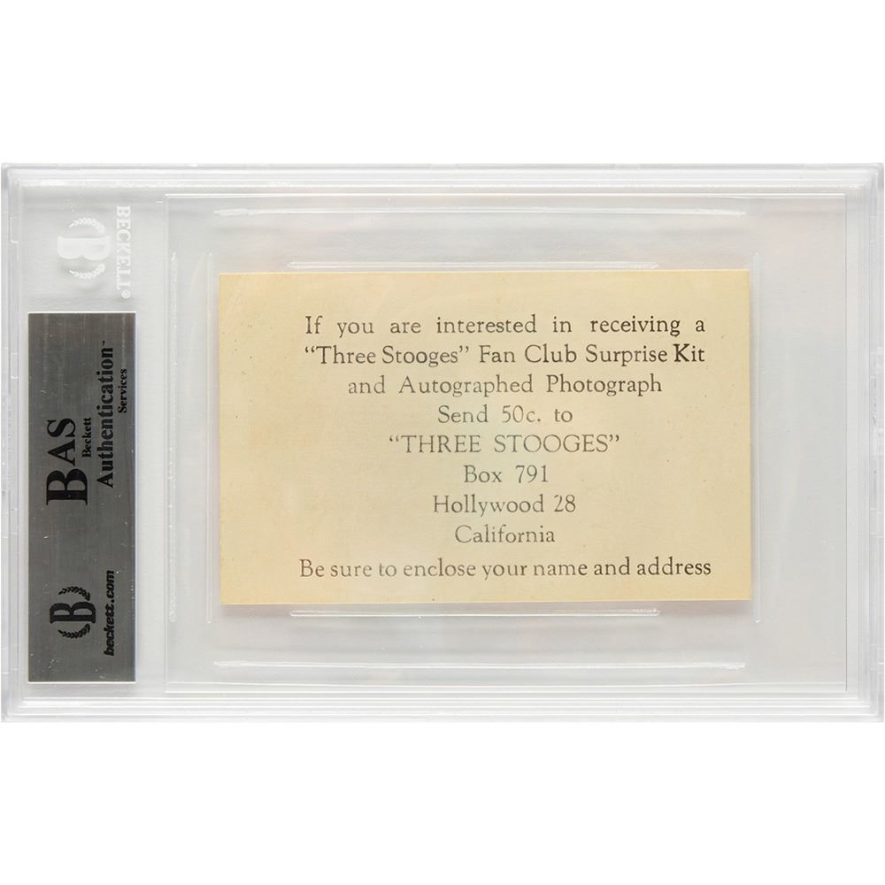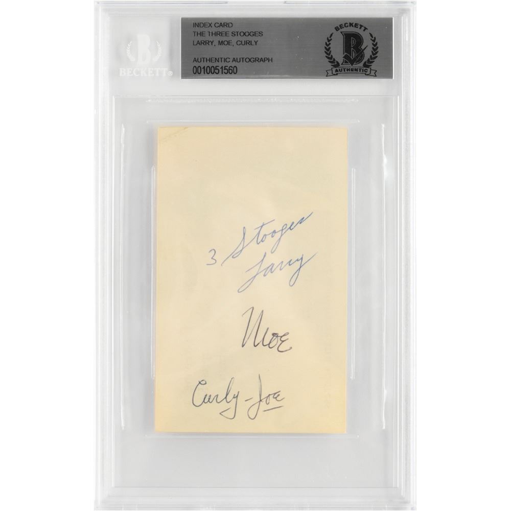 Vintage ballpoint signatures, "3 Stooges, Larry," "Moe," and "Curly Joe," on the reverse of an off-white 4.25 x 2.75 Three Stooges fan club card. In fine condition. Encapsulated a Beckett authentication holder.