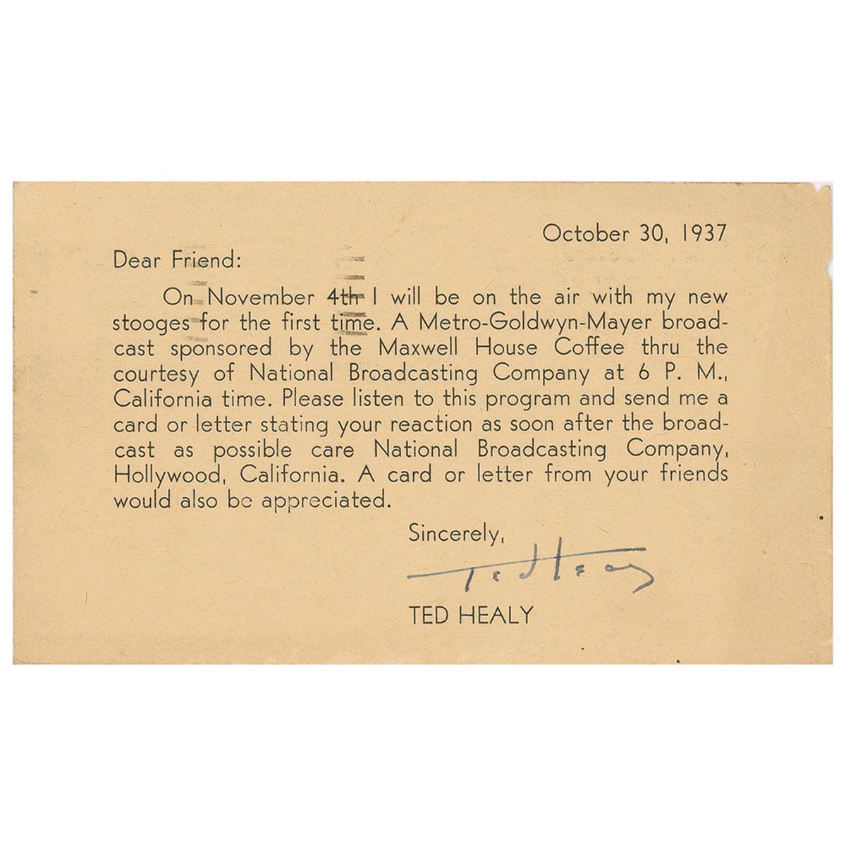 American actor (1896–1937) who, as a vaudeville impresario, assembled the act that evolved into the Three Stooges. The tumultuous relationship between Healy and his star trio, fueled largely by Healy’s heavy drinking, led to several rifts and reconciliations, until the Stooges struck out on their own for good in 1934. TLS, one page, 5.5 x 3.25, October 30, 1937. Letter to a fan reads, in part: “On November 4th I will be on the air with my new stooges for the first time…Please listen to this program and send me a card or letter stating your reaction as soon after the broadcast as possible.” Scattered light soiling, uniform toning and light cancellation marks near top, otherwise fine condition. The original Stooges (Moe, Larry, and Curly) left Healy for good in 1934, only to be ‘replaced’ by some “new stooges” three years later.