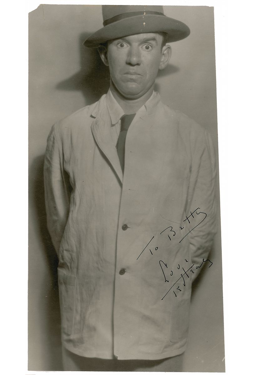 American actor (1896–1937) who, as a vaudeville impresario, assembled the act that evolved into the Three Stooges. Scarce vintage 6.25 x 12 half-length photo of Healy, boldly signed and inscribed in fountain pen, “To Betty, Love, Ted Healy.” In very good condition, with trimmed edges, missing upper left corner tip, a small repaired tear to the brim of his hat, and overall quite brittle. The pristine signature stands out nicely against the light background.