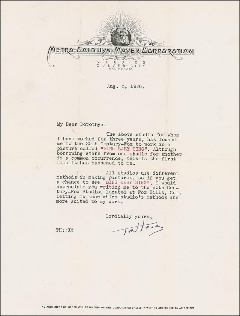 American actor (1896–1937) who, as a vaudeville impresario, assembled the act that evolved into the Three Stooges. The tumultuous relationship between Healy and his star trio, fueled largely by Healy’s heavy drinking, led to several rifts and reconciliations, until the Stooges struck out on their own for good in 1934. TLS, one page, 8.25 x 11, Metro-Goldwyn-Mayer Corporation letterhead, August 3, 1936. Healy asks professional advice. In full: “The above studio for whom I have worked for three years, has loaned me to the 20th Century-Fox to work in a picture called ‘Sing Baby Sing’. Although borrowing stars from one studio for another is a common occurrence, this is the first time it has happened to me. All studios use different methods in making pictures, so if you get a chance to see ‘Sing Baby Sing’, I would appreciate you writing me to the 20th Century-Fox Studios located at Fox Hills, Cal. letting me know which studio’s methods are more suited to my work.” In fine condition, with intersecting folds and trivial creasing. Pre-certified PSA/DNA and RRAuction COA.