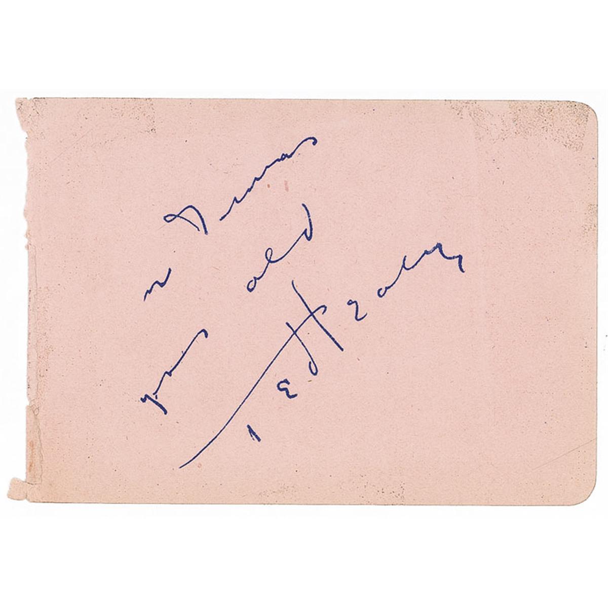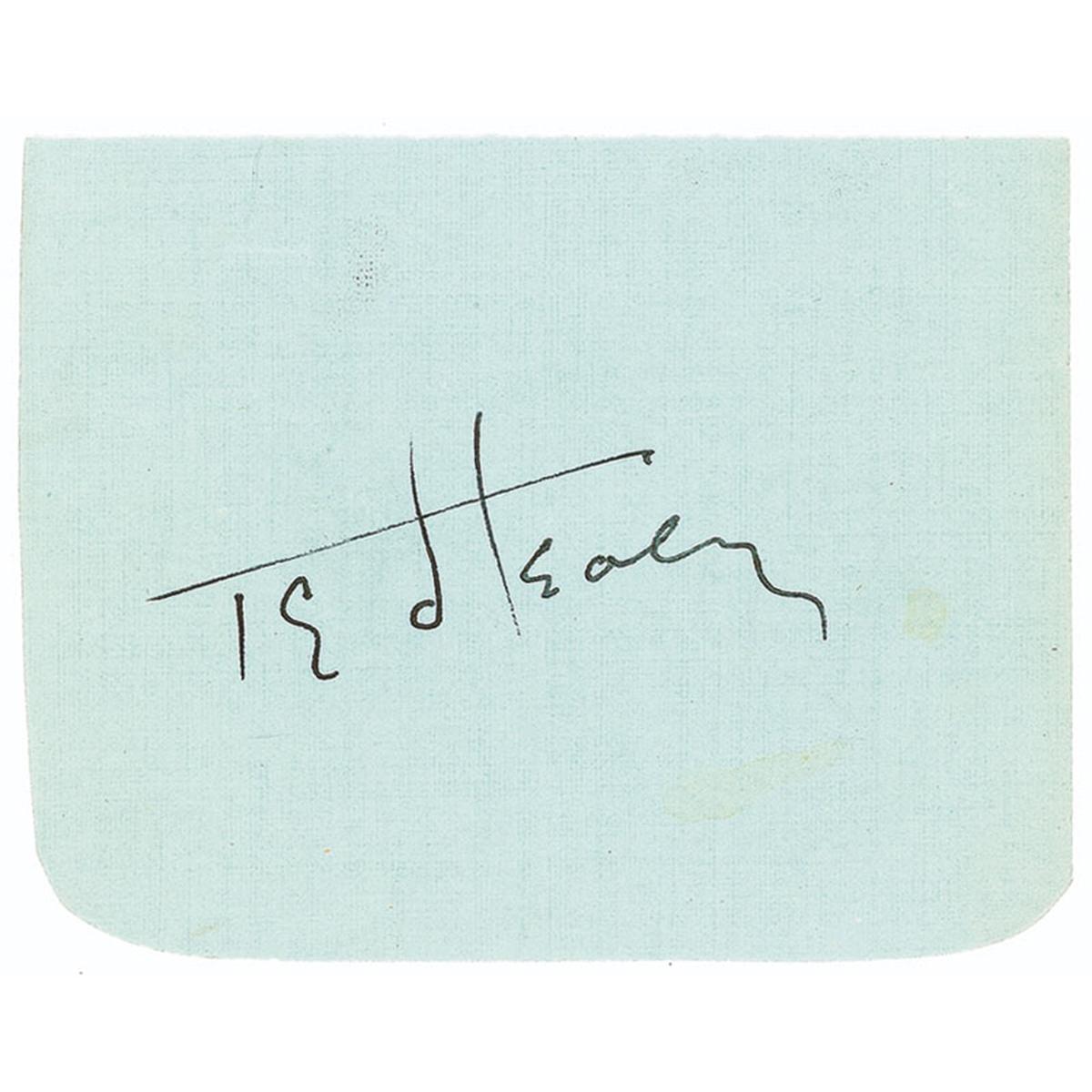 American actor (1896–1937) who, as a vaudeville impresario, assembled the act that evolved into the Three Stooges. The tumultuous relationship between Healy and his star trio led to several rifts until the Stooges struck out on their own for good in 1934. Two fountain pen signatures, “Ted Healy” (one ins), on individual album pages. In overall fine condition with light show-through from writing on the reverse of one item.