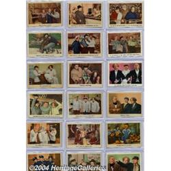 <B>Three Stooges Trading Cards #1-96 (Fleer, 1959).</B></I> This is a complete set of the first series of Stooges trading cards. The fronts of the cards feature colorized scenes with witty quotes. The backs have jokes (which are actually funny) and other little tidbits such as biographical information on the Stooges (who are in their original combination of Larry, Moe, and Curly here). There' s no bubblegum (wise guy, eh?), but all cards in this complete set have been preserved in plastic sleeves. Approximately one-third of the cards grade at NM or better; another third are nearly evenly divided between the EX-MT and EX ranges; and another third of the set grades VG-EX. <BR><BR><B>Important notice:</B> Heritage usually auctions material at the rate of 200-250 lots per hour. On some occasions eBay Live bid software or the Internet may not be able to keep up with the pace of the auction. We recommend placing a realistic absentee bid now as insurance to avoid disappointment. Occasionally the auctioneer may eliminate or reject an eBay Live bid, and the auctioneer may also reopen a lot after the close of the eBay live bidding (usually because we missed an audience bid), and may reject your bid even if it shows you as the winning bidder. By bidding via eBay Live, you agree that Heritage may award the lot to another bidder at its sole discretion under the circumstances described above or any other reasonable circumstances. Since eBay bids are not shown to us until we open the lot on the floor, we treat those bids just like floor bids. In most cases the floor responds before the eBay bid is presented to us, due to Internet lag time, so for consistency we have made it a policy that floor bids are always considered first over tie eBay live bids. Also please note that all Heritage lots purchased through eBay Live carry a 20% Buyer's Premium. Please make sure you read the Terms and Conditions before you bid.