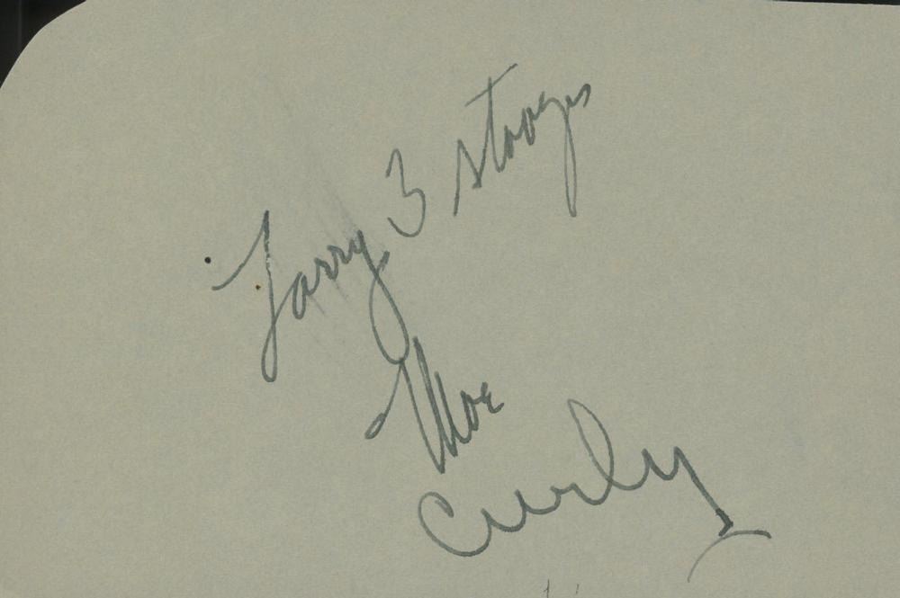 Three Stooges autograph slip signed by Larry Fine, Moe Howard and Curly Howard. GFA Authenticated