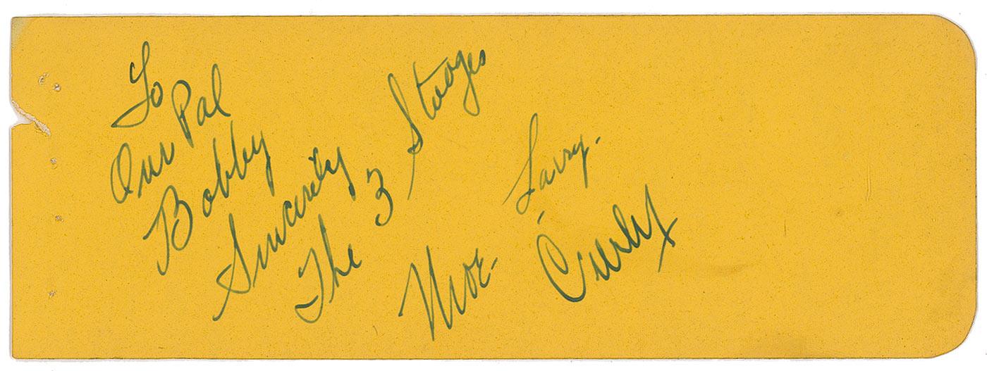Vintage fountain pen signatures and inscription, “To our pal Bobby, Sincerely, the 3 Stooges, Moe,” “Larry,” and “Curly,” on a goldenrod 6 x 2 album page. In fine condition, with a small chip and binding holes at left edge, and a hint of subtle soiling.
