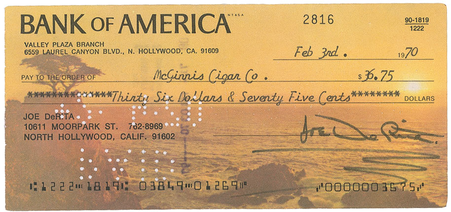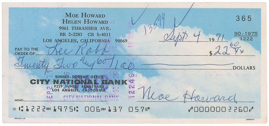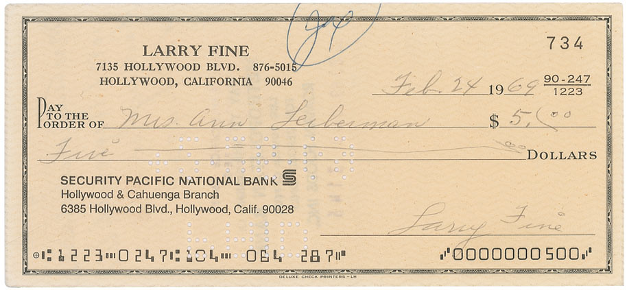 Three personal checks, all measuring 6 x 2.75: one filled out and signed by Moe Howard from 1971; one filled out and signed by Larry Fine from 1969; and one filled out in type and signed by Joe DeRita from 1970. In overall fine condition, with a central vertical fold to two checks, expected cancellation holes and stamps, and Larry’s signature and writing a shade light.
