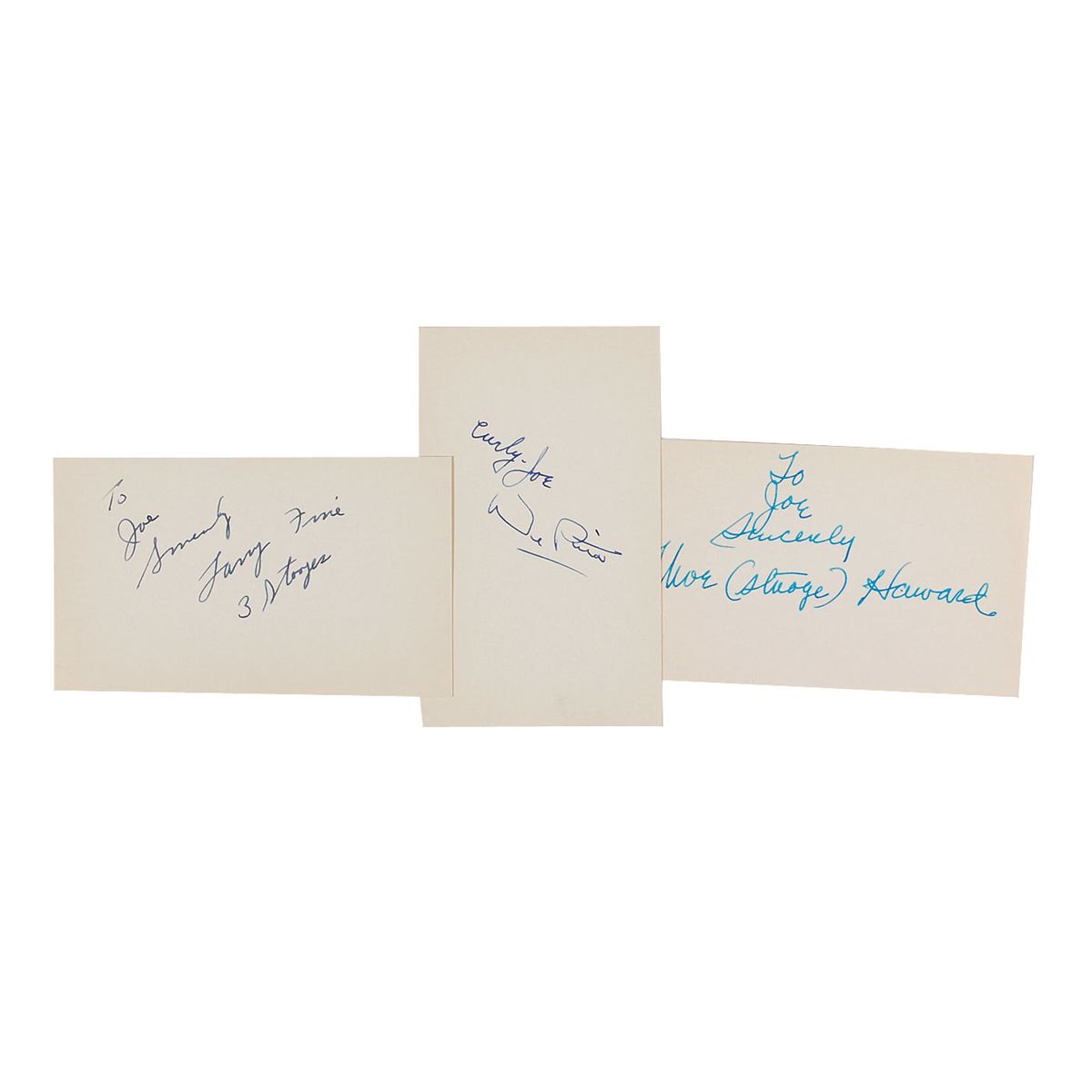 In-person ink signatures and inscriptions, “To Joe, Sincerely, Moe (Stooge) Howard,” “To Joe, Sincerely, Larry Fine 3 Stooges,” and “Curly—Joe DeRita,” on individual off-white 5 x 3 cards. In fine condition.