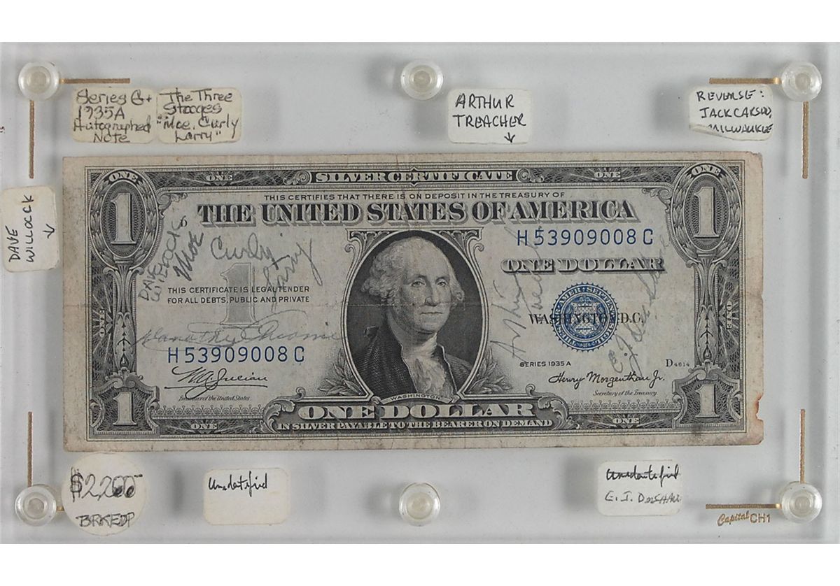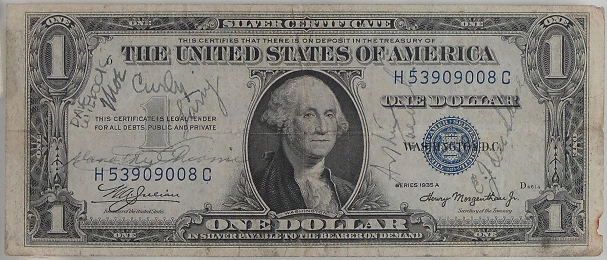 Series 1935 A one dollar bill, signed on the portrait side in fountain pen on the blank light portion, “Moe,“ “Larry,” and “Curly.” Bill is signed by five others including Arthur Treacher. In fine condition, with central horizontal and vertical folds and expected light wrinkling and age wear.