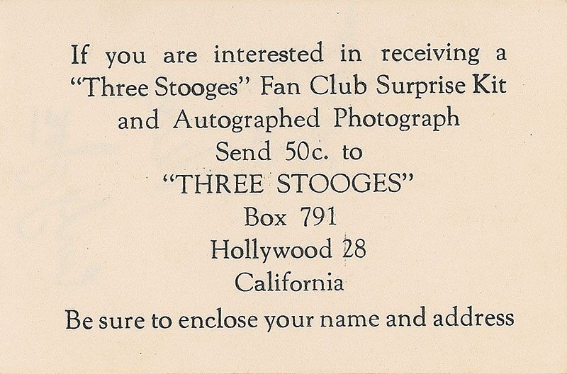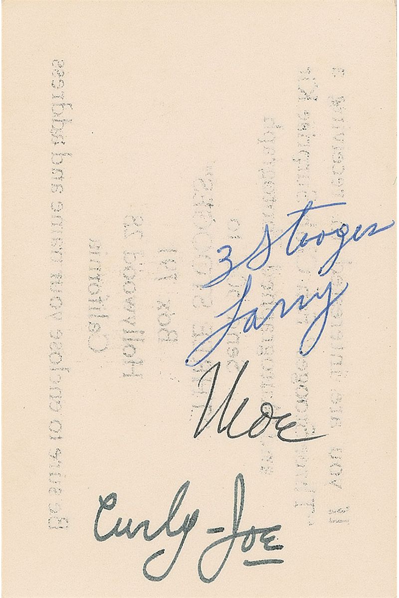 Three Stooges Fan Club “Surprise Kit” order card, signed on the reverse in blue ballpoint, “3 Stooges, Larry,” in black ballpoint, “Moe,“ and in black felt tip, “Curly-Joe.” In fine condition.