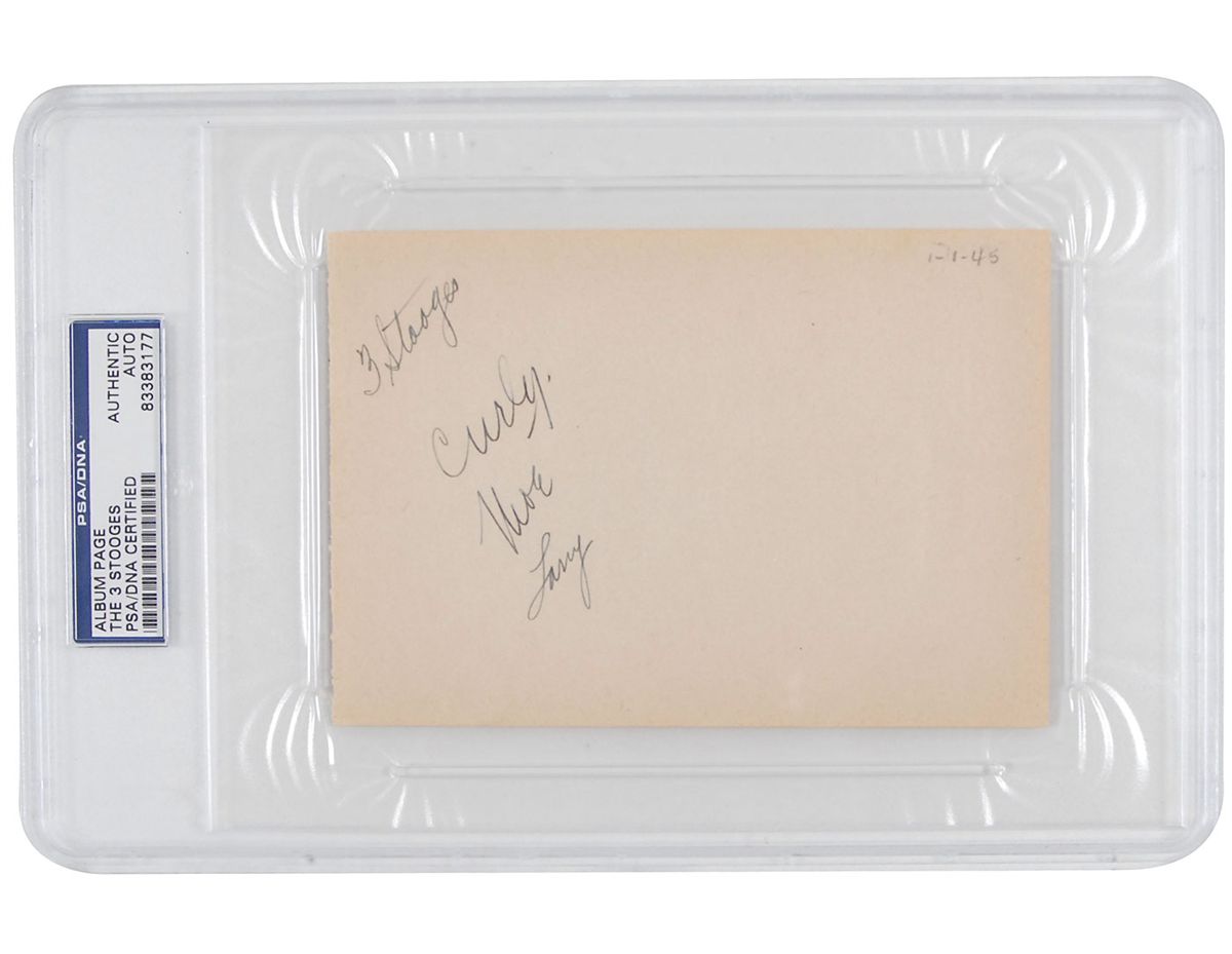 Vintage fountain pen signatures, “Curly,” “3 Stooges, Moe,” and “Larry,” on an off-white 6 x 4 album page bearing a collector’s date notation of January 1, 1945, to the upper right corner. Encapsulated in a plastic PSA/DNA authentication holder. In fine condition, with light overall toning. A much sought-after fully-signed example from the Three Stooges during their prime.