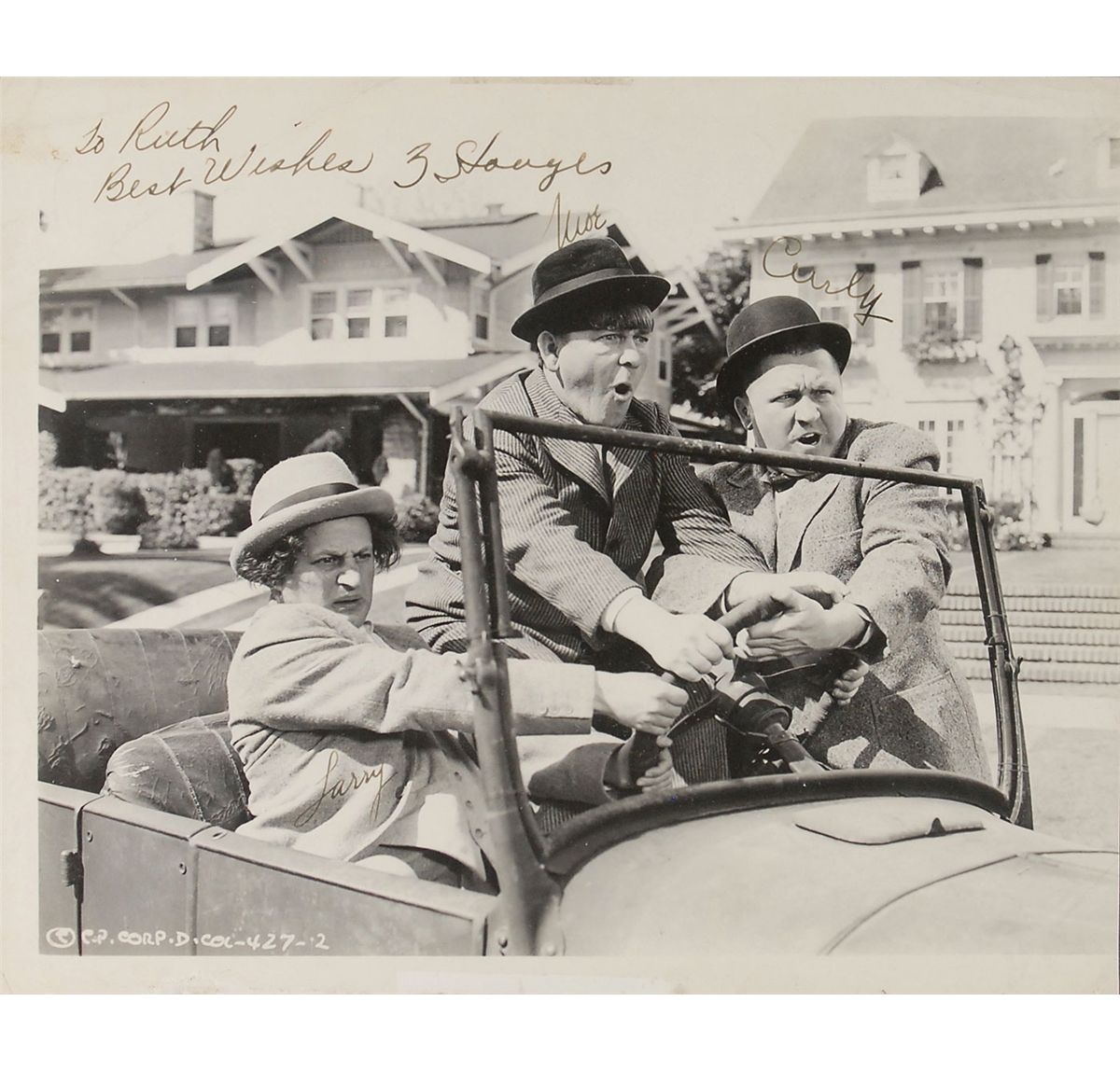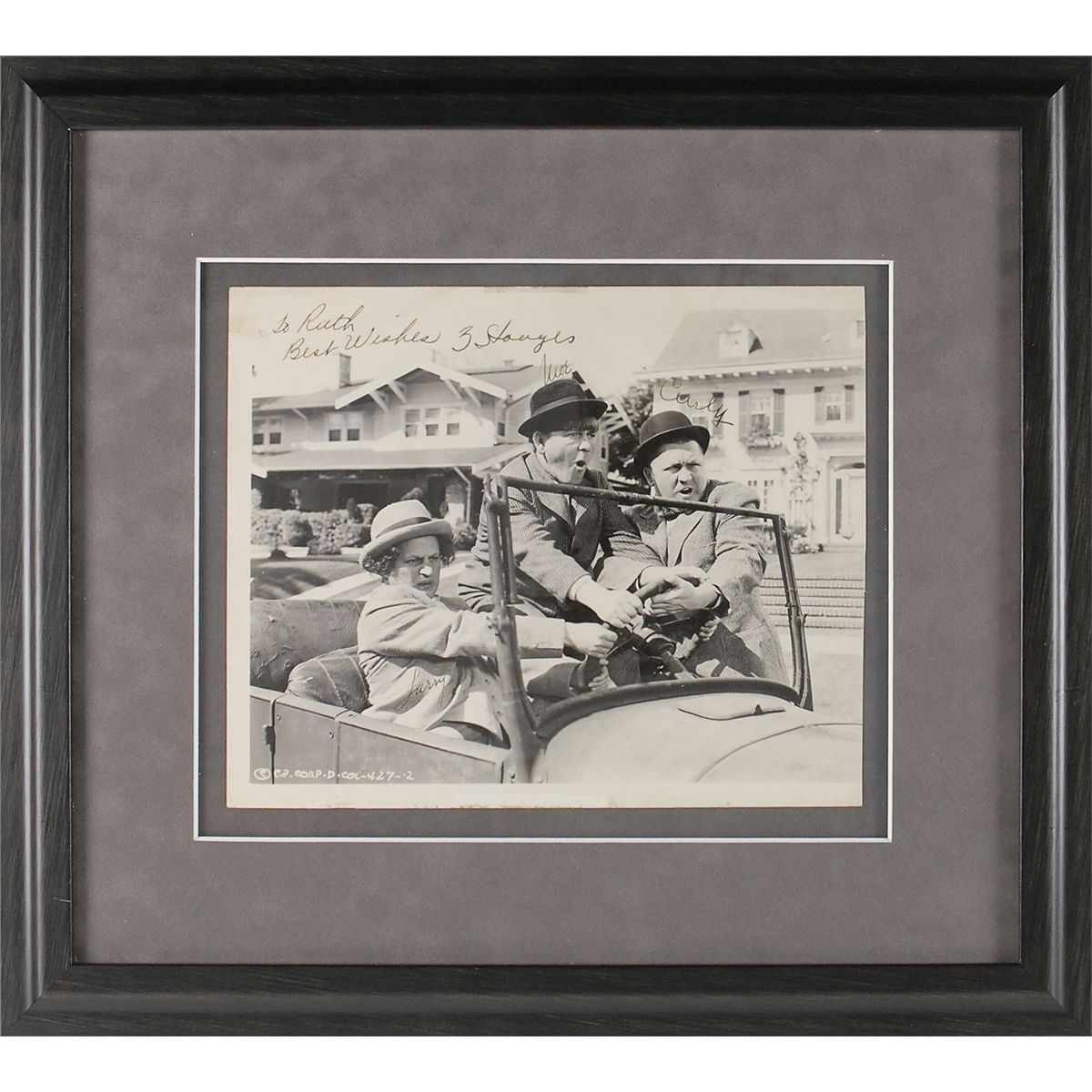 Vintage glossy 9.75 x 8 photo of Moe, Larry, and Curly all trying to steer a car at the same time, signed and inscribed in fountain pen, “To Ruth, Best wishes, Moe,” “Larry,” and “Curly,” Curly has also added “3 Stooges,” next to Moe’s inscription. Archivally double-suede-matted and framed to an overall size of 17 x 15. In very good condition, with trimmed right edge, scattered surface marks and creasing, heavier to the corners, small tear and paper loss to lower edge and light adhesive remnant to top edge.