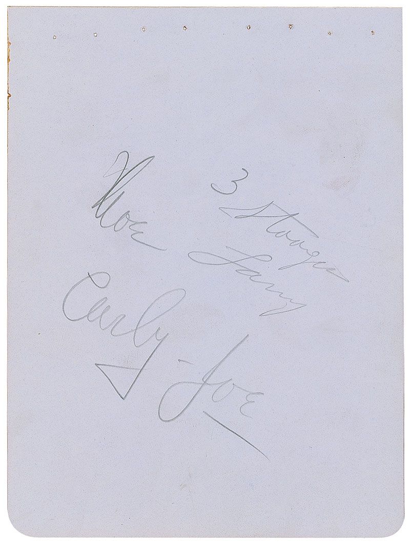 Highly desirable set of pencil signatures, “3 Stooges, Larry,” “Moe,” and “Curly-Joe,” on an off-white 6 x 4 album page. In fine condition, with light scattered soiling. Accompanied by a photocopied provenance statement from the original recipient, stating that he acquired these signatures during a Three Stooges appearance in St. Louis.